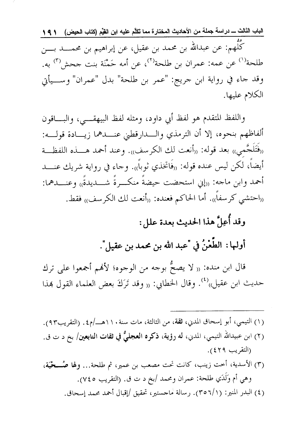 كُلُّهم: عن عبد الله بن محمد بن عقيل، عن إبراهيم بن محمد بن طلحة1 عن عمه: عمران بن طلحة2، عن أمه حَمْنَة بنت جحش3 به. وقد جاء في رواية ابن جريج: "عمر بن طلحة" بدل "عمران" وسيأتي الكلام عليها.
