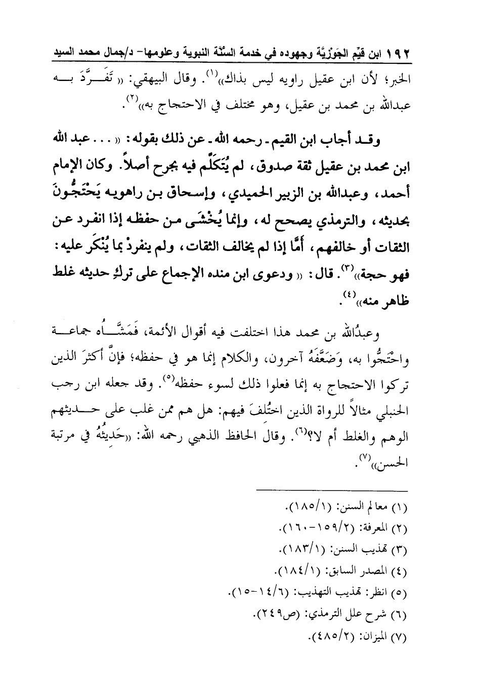وقد أجاب ابن القيم - رحمه الله - عن ذلك بقوله: " عبد الله ابن محمد بن عقيل ثقة صدوق، لم يُتَكَلَّم فيه بجرح أصلاً. وكان الإمام أحمد، وعبد الله بن الزبير الحميدي، وإسحاق بن راهويه يَحْتَجُّونَ بحديثه، والترمذي يصحح له، وإنما يُخْشَى من حفظه إذا انفرد عن الثقات أو خالفهم، أَمَّا إذا لم يخالف الثقات، ولم ينفردْ بما يُنْكَر عليه: فهو حجة"3. قال: "ودعوى ابن منده الإجماع على تركِ حديثه غلط ظاهر منه"4.