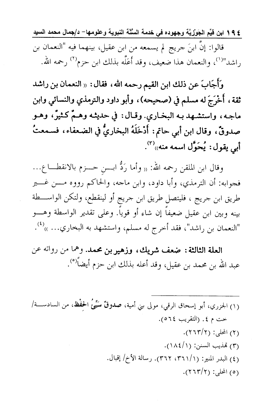وقال ابن الملقن رحمه الله: "وأما رَدُّ ابنِ حزم بالانقطاع ... فجوابه: أن الترمذي، وأبا داود، وابن ماجه، والحاكم رووه من غير طريق ابن جريج، فليتصل طريق ابن جريج أو لينقطع، ولتكن الواسطة بينه وبين ابن عقيل ضعيفاً إن شاء أو قوياً. وعلى تقدير الواسطة وهو "النعمان بن راشد"، فقد أخرج له مسلم، واستشهد به البخاري ... "4.