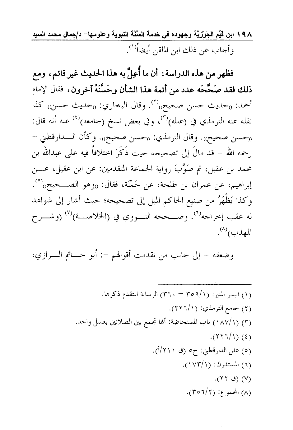 فظهر من هذه الدراسة: أن ما أُعِلَّ به هذا الحديث غير قائم، ومع ذلك فقد صَحَّحَه عدد من أئمة هذا الشأن وحَسَّنَهُ آخرون، فقال الإمام أحمد: "حديث حسن صحيح"2. وقال البخاري: "حديث حسن" كذا نقله عنه الترمذي في (علله) 3، وفي بعض نسخ (جامعه) 4 عنه أنه قال: "حسن صحيح". وقال الترمذي: "حسن صحيح". وكأن الدارقطني - رحمه الله - قد مالَ إلى تصحيحه حيث ذَكَرَ اختلافاً فيه علي عبد الله بن محمد بن عقيل، ثم صَوَّبَ رواية الجماعة المتقدمين: عن ابن عقيل، عن إبراهيم، عن عمران بن طلحة، عن حَمْنَة، فقال: "وهو الصحيح"5. وكذا يَظْهَرُ من صنيع الحاكم الميل إلى تصحيحه؛ حيث أشار إلى شواهد له عقب إخراجه6. وصححه النووي في (الخلاصة) 7 (وشرح المهذب) 8.