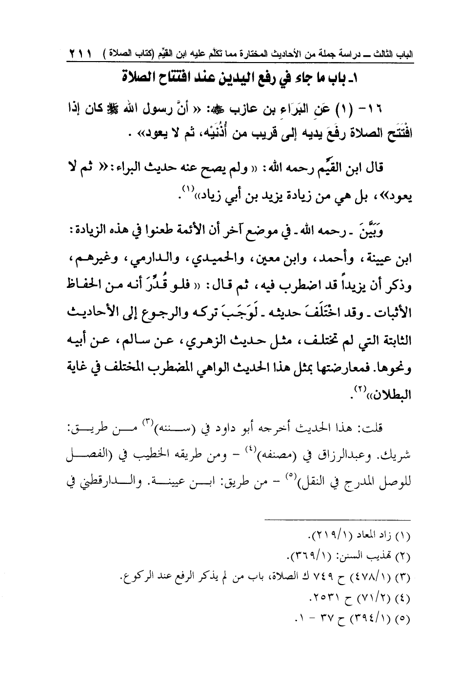 16- (1) عَنِ البَرَاءِ بن عازب رضي الله عنه: "أنَّ رسول الله صلى الله عليه وسلم كان إذا افْتَتَح الصلاة رفَعَ يديه إلى قريب من أُذُنَيْه، ثم لا يعود".