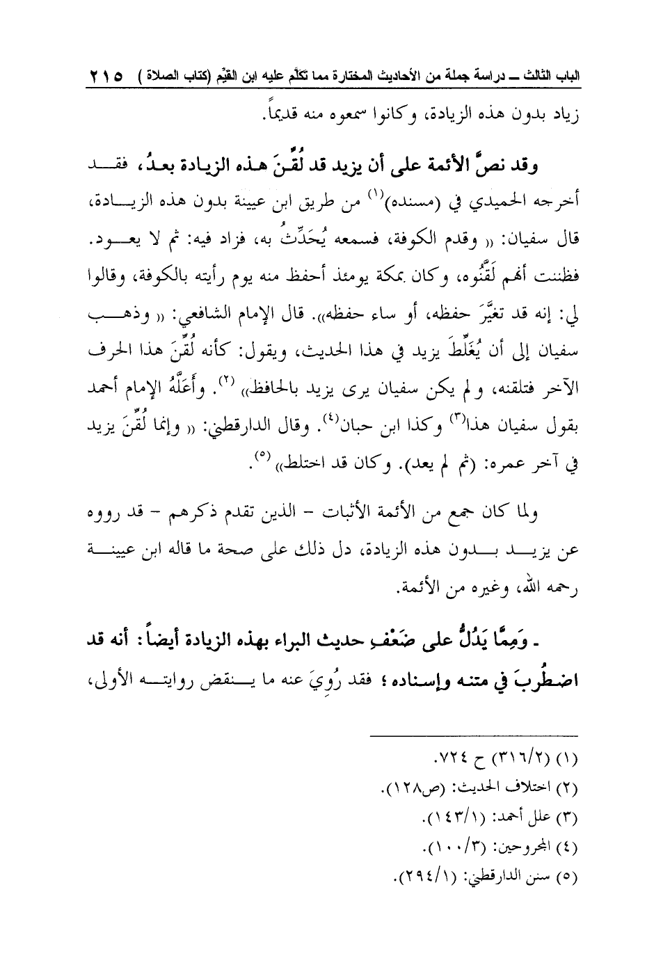 وقد نصَّ الأئمة على أن يزيد قد لُقِّنَ هذه الزيادة بعدُ، فقد أخرجه الحميدي في (مسنده) 1 من طريق ابن عيينة بدون هذه الزيادة، قال سفيان: "وقدم الكوفة، فسمعه يُحَدِّثُ به، فزاد فيه: ثم لا يعود. فظننت أنهم لَقَّنُوه، وكان بمكة يومئذ أحفظ منه يوم رأيته بالكوفة، وقالوا لي: إنه قد تغيَّرَ حفظه، أو ساء حفظه". قال الإمام الشافعي: "وذهب سفيان إلى أن يُغَلِّطَ يزيد في هذا الحديث، ويقول: كأنه لُقِّنَ هذا الحرف الآخر فتلقنه، ولم يكن سفيان يرى يزيد بالحافظ"2. وأَعَلَّهُ الإمام أحمد بقول سفيان هذا3 وكذا ابن حبان4. وقال الدارقطني: "وإنما لُقِّنَ يزيد في آخر عمره: (ثم لم يعد) . وكان قد اختلط"5.
