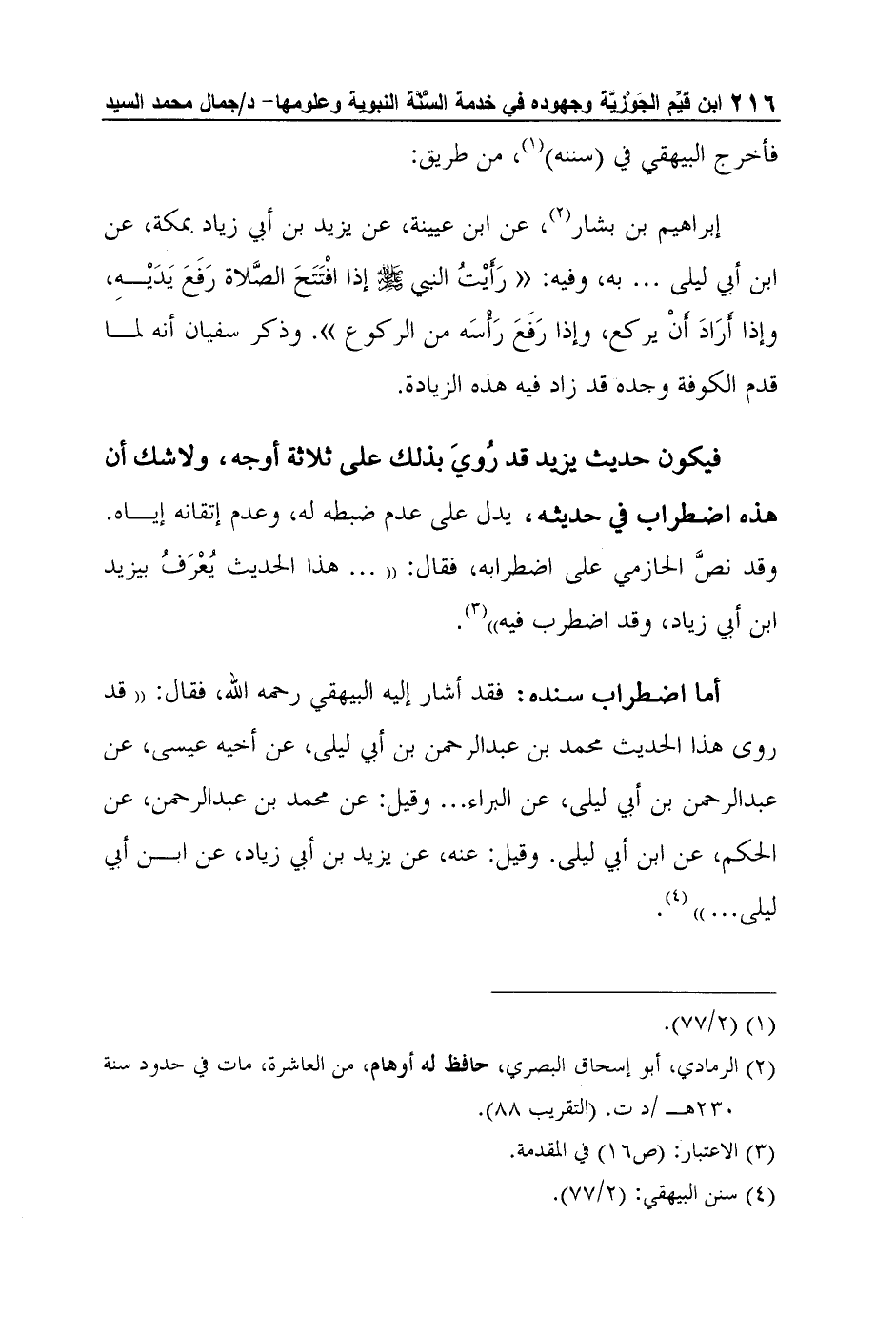 أما اضطراب سنده: فقد أشار إليه البيهقي رحمه الله، فقال: "قد روى هذا الحديث محمد بن عبد الرحمن بن أبي ليلى، عن أخيه عيسى، عن عبد الرحمن بن أبي ليلى، عن البراء ... وقيل: عن محمد بن عبد الرحمن، عن الحكم، عن ابن أبي ليلى. وقيل: عنه، عن يزيد بن أبي زياد، عن ابن أبي ليلى ... "4.