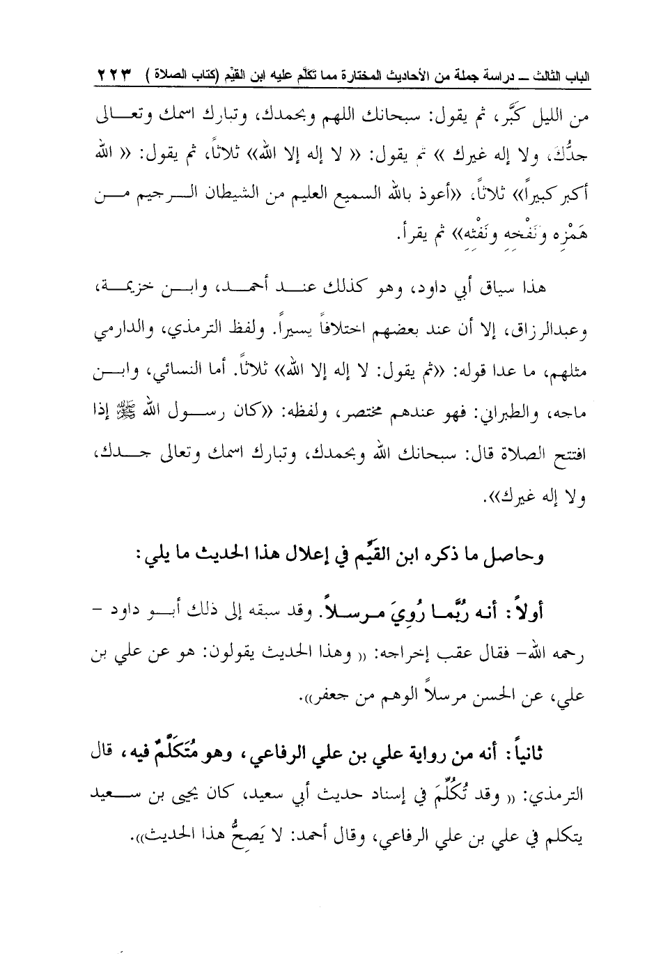 هذا سياق أبي داود، وهو كذلك عند أحمد، وابن خزيمة، وعبد الرزاق، إلا أن عند بعضهم اختلافاً يسيراً. ولفظ الترمذي، والدارمي مثلهم، ما عدا قوله: "ثم يقول: لا إله إلا الله" ثلاثاً. أما النسائي، وابن ماجه، والطبراني: فهو عندهم مختصر، ولفظه: "كان رسول الله صلى الله عليه وسلم إذا افتتح الصلاة قال: سبحانك الله وبحمدك، وتبارك اسمك وتعالى جدك، ولا إله غيرك".