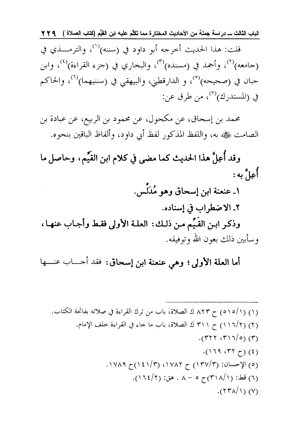 وذكر ابن القَيِّم من ذلك: العلة الأولى فقط وأجاب عنها، وسأبين ذلك بعون الله وتوفيقه.