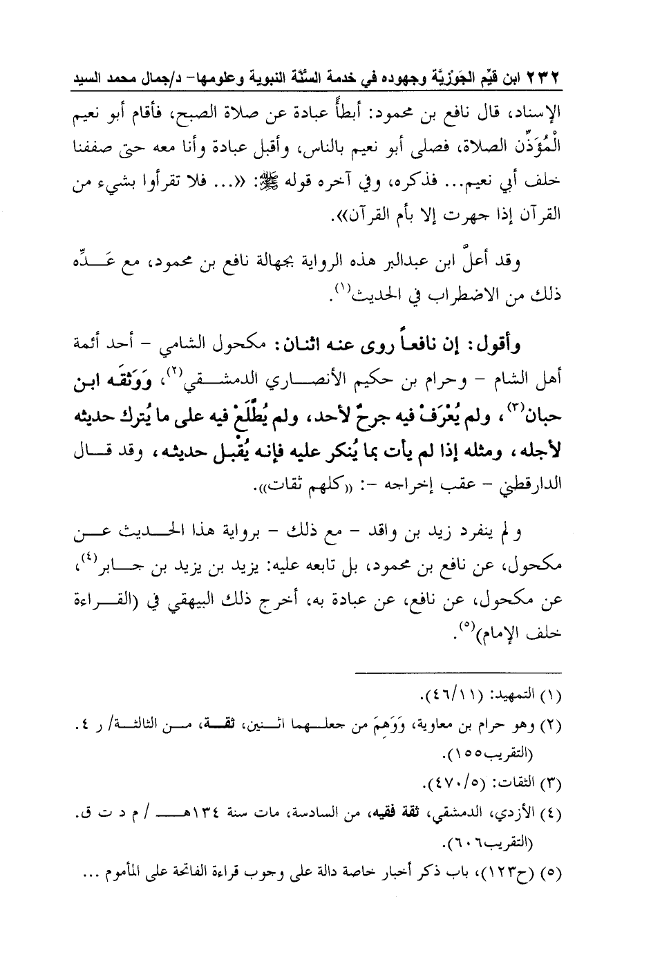 وأقول: إن نافعاً روى عنه اثنان: مكحول الشامي - أحد أئمة أهل الشام - وحرام بن حكيم الأنصاري الدمشقي2، وَوَثقَه ابن حبان3، ولم يُعْرَفْ فيه جرحٌ لأحد، ولم يُطَّلَعْ فيه على ما يُترك حديثه لأجله، ومثله إذا لم يأت بما يُنكر عليه فإنه يُقْبل حديثه، وقد قال الدارقطني - عقب إخراجه -: "كلهم ثقات".