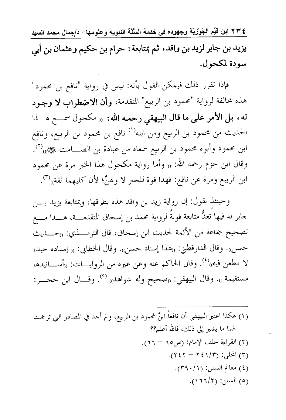 فإذا تقرر ذلك فيمكن القول بأنه: ليس في رواية "نافع بن محمود" هذه مخالفة لرواية "محمود بن الربيع" المتقدمة، وأن الاضطراب لا وجود له، بل الأمر على ما قال البيهقي رحمه الله: "مكحول سمع هذا الحديث من محمود بن الربيع ومن ابنه1 نافع بن محمود بن الربيع، ونافع ابن محمود وأبوه محمود بن الربيع سمعاه من عبادة بن الصامت رضي الله عنه"2. وقال ابن حزم رحمه الله: "وأما رواية مكحول هذا الخبر مرة عن محمود ابن الربيع ومرة عن نافع: فهذا قوة للخبر لا وهنٌ؛ لأن كليهما ثقة"3.