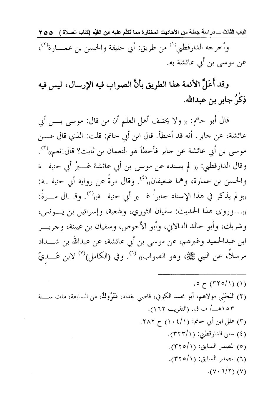 قال أبو حاتم: "ولا يختلف أهل العلم أن من قال: موسى بن أبي عائشة، عن جابر. أنه قد أخطأ. قال ابن أبي حاتم: قلت: الذي قال عن موسى بن أبي عائشة عن جابر فأخطأ هو النعمان بن ثابت؟ قال: نعم"3. وقال الدارقطني: "لم يسنده عن موسى بن أبي عائشة غيرُ أبي حنيفة والحسن بن عمارة، وهما ضعيفان"4. وقال مرةً عن رواية أبي حنيفة: "ولم يذكر في هذا الإسناد جابراً غير أبي حنيفة"5. وقال مرةً: " ... وروى هذا الحديث: سفيان الثوري، وشعبة، وإسرائيل بن يونس، وشريك، وأبو خالد الدالاني، وأبو الأحوص، وسفيان بن عيينة، وجرير ابن عبد الحميد وغيرهم، عن موسى بن أبي عائشة، عن عبد الله بن شداد مرسلاً، عن النبي صلى الله عليه وسلم، وهو الصواب"6. وفي (الكامل) 7 لابن عَدِيّ