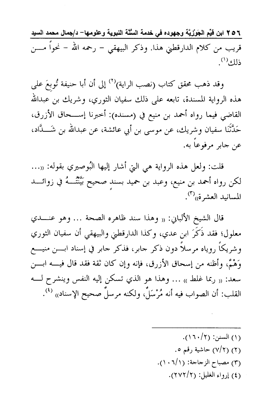 قال الشيخ الألباني: "وهذا سند ظاهره الصحة ... وهو عندي معلول؛ فقد ذَكَرَ ابن عدي، وكذا الدارقطني والبيهقي أن سفيان الثوري وشريكاً روياه مرسلاً دون ذكر جابر، فذكر جابر في إسناد ابن منيع وَهْمٌ، وأظنه من إسحاق الأزرق، فإنه وإن كان ثقة فقد قال فيه ابن سعد: "ربما غلط" ... وهذا هو الذي تسكن إليه النفس وينشرح له القلب: أن الصواب فيه أنه مُرْسَلٌ، ولكنه مرسلٌ صحيح الإسناد"4.