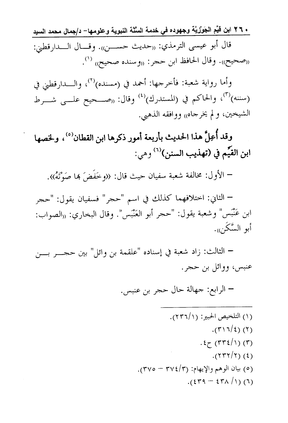 - الثاني: اختلافهما كذلك في اسم "حجر" فسفيان يقول: "حجر ابن عَنْبَس" وشعبة يقول: "حجر أبو العَنْبَس". وقال البخاري: "الصواب: أبو السَّكَن".