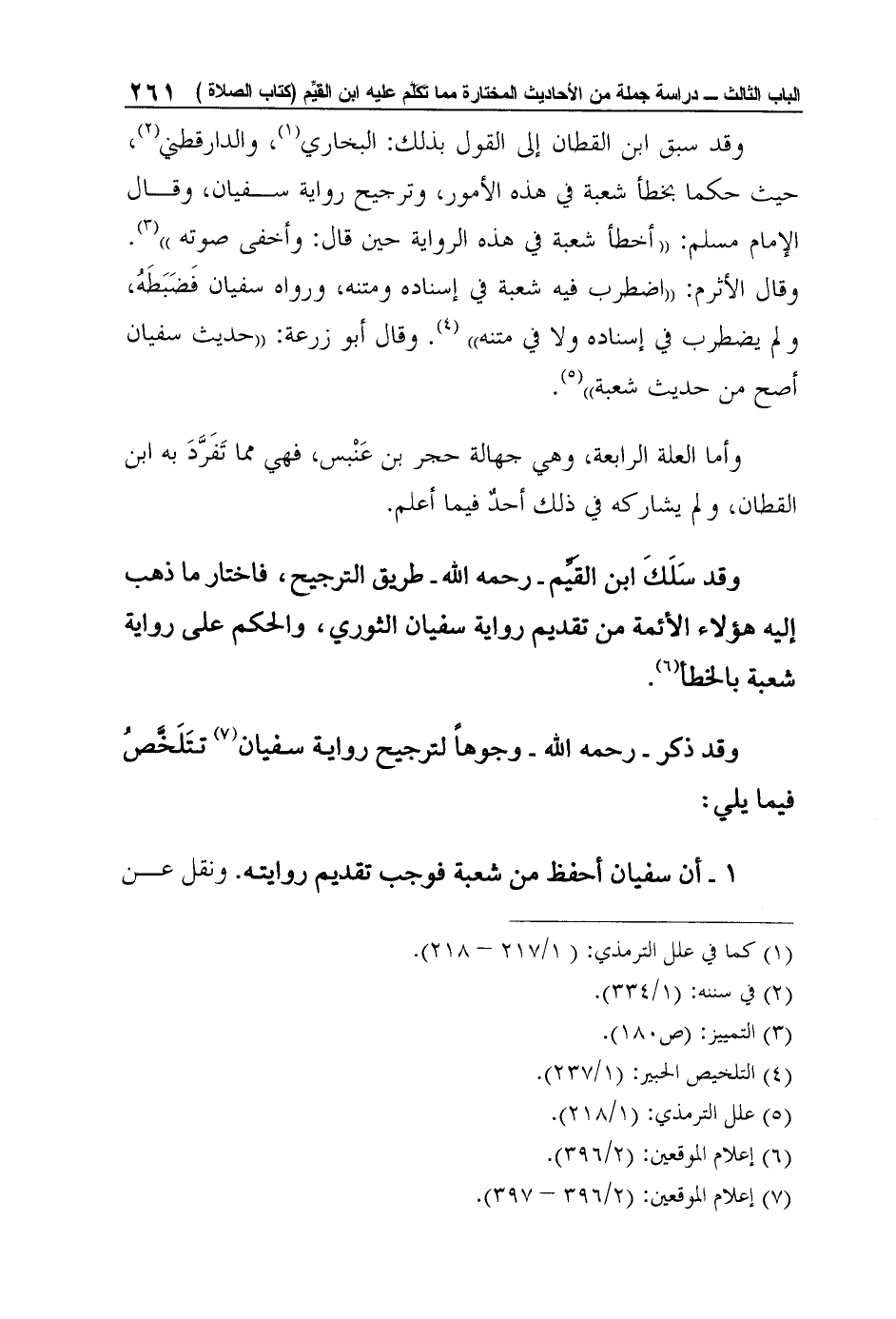 وقد سَلَكَ ابن القَيِّم - رحمه الله - طريق الترجيح، فاختار ما ذهب إليه هؤلاء الأئمة من تقديم رواية سفيان الثوري، والحكم على رواية شعبة بالخطأ6.