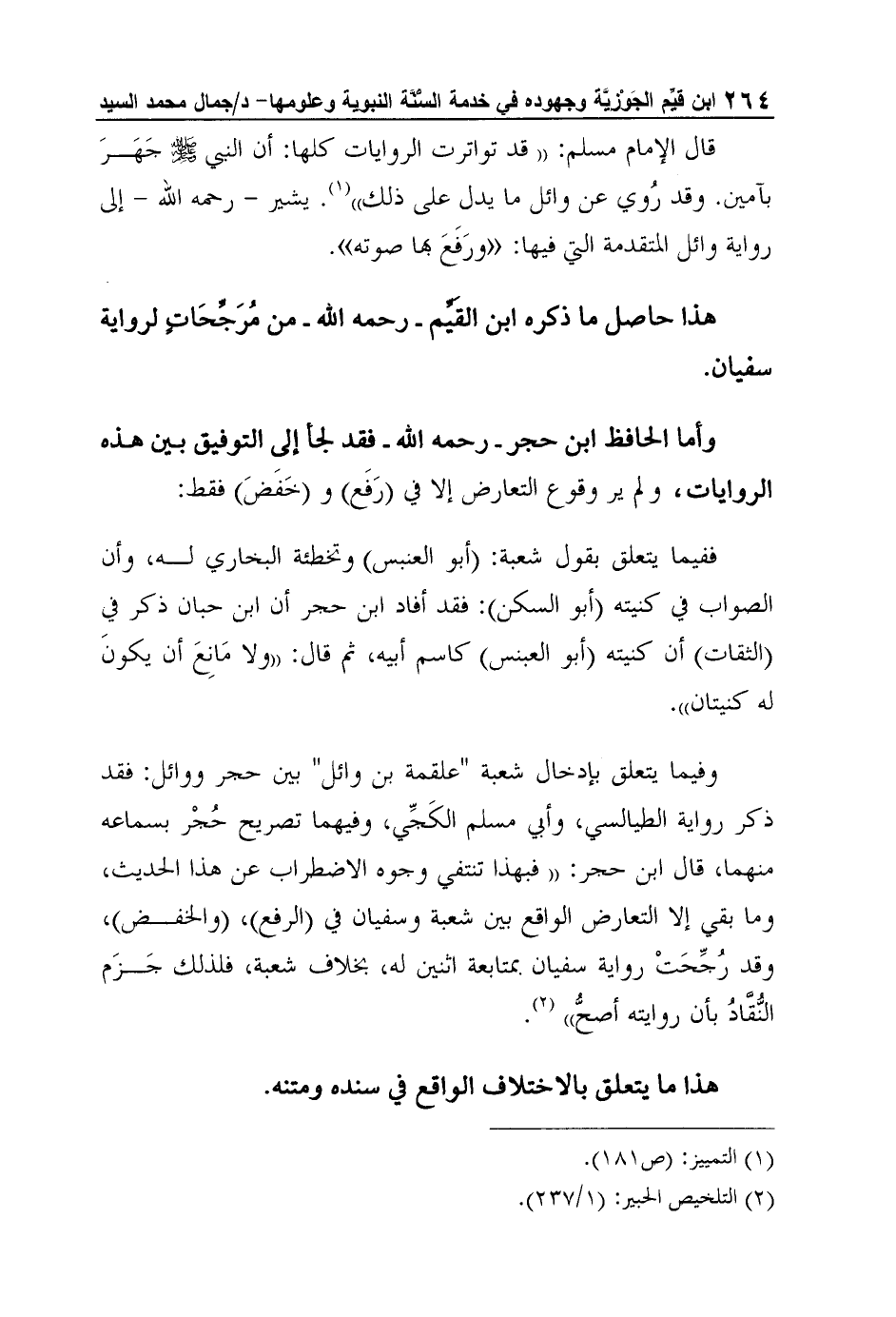 وفيما يتعلق بإدخال شعبة "علقمة بن وائل" بين حجر ووائل: فقد ذكر رواية الطيالسي، وأبي مسلم الكَجِّي، وفيهما تصريح حُجْر بسماعه منهما، قال ابن حجر: "فبهذا تنتفي وجوه الاضطراب عن هذا الحديث، وما بقي إلا التعارض الواقع بين شعبة وسفيان في (الرفع) ، (والخفض) ، وقد رُجِّحَتْ رواية سفيان بمتابعة اثنين له، بخلاف شعبة، فلذلك جَزَم النُّقَّادُ بأن روايته أصحُّ"2.