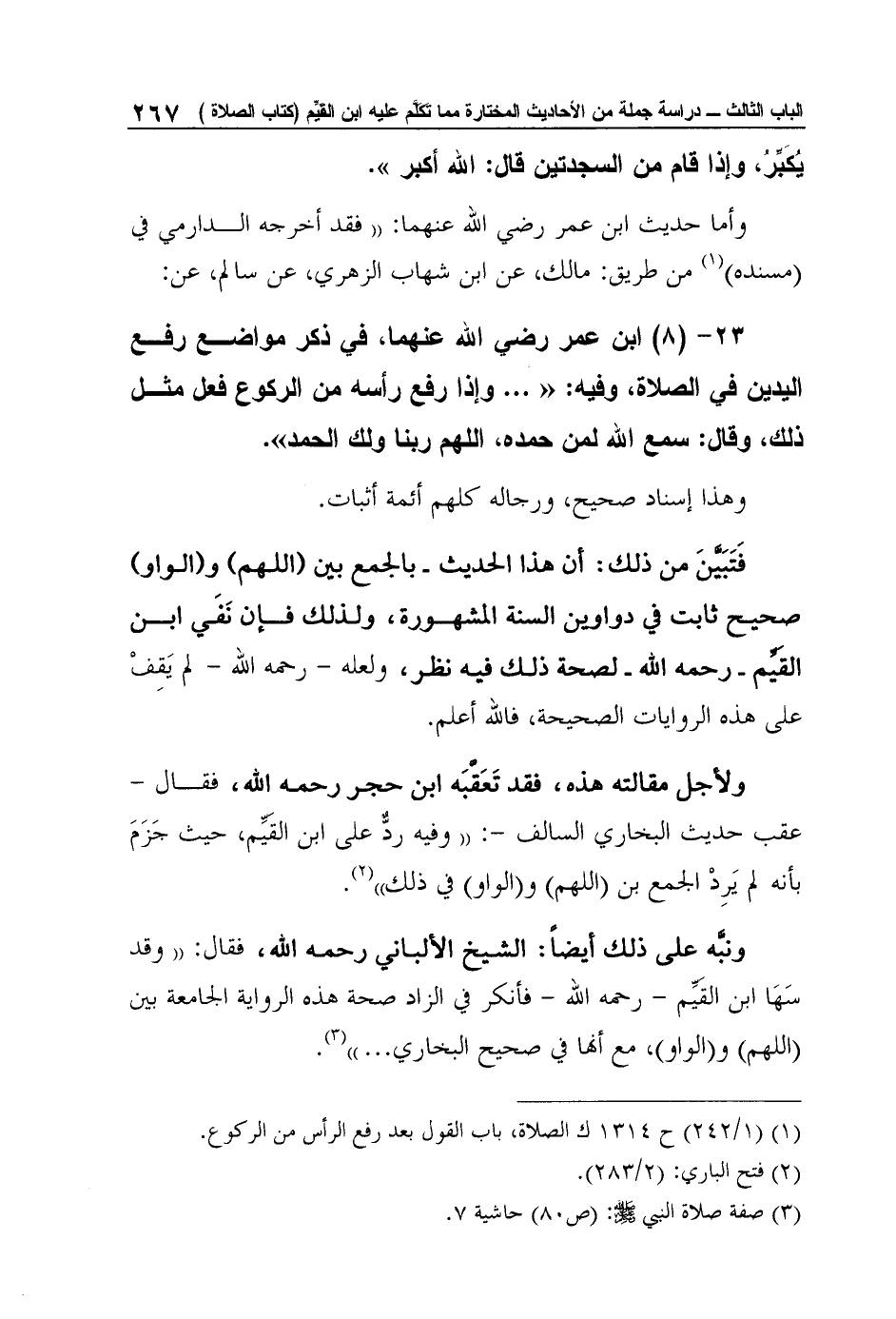 ونبَّه على ذلك أيضاً: الشيخ الألباني رحمه الله، فقال: "وقد سَهَا ابن القَيِّم - رحمه الله - فأنكر في الزاد صحة هذه الرواية الجامعة بين (اللهم) و (الواو) ، مع أنها في صحيح البخاري ... "3.