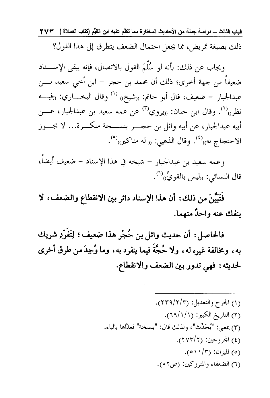 ويجاب عن ذلك: بأنه لو سُلِّمَ القول بالاتصال، فإنه يبقى الإسناد ضعيفاً من جهة أخرى؛ ذلك أن محمد بن حجر - ابن أخي سعيد بن عبد الجبار - ضعيف، قال أبو حاتم: "شيخ"1 وقال البخاري: "فيه نظر"2. وقال ابن حبان: "يروي3 عن عمه سعيد بن عبد الجبار، عن أبيه عبد الجبار، عن أبيه وائل بن حجر بنسخة منكرة ... لا يجوز الاحتجاج به"4. وقال الذهبي: "له مناكير"5.