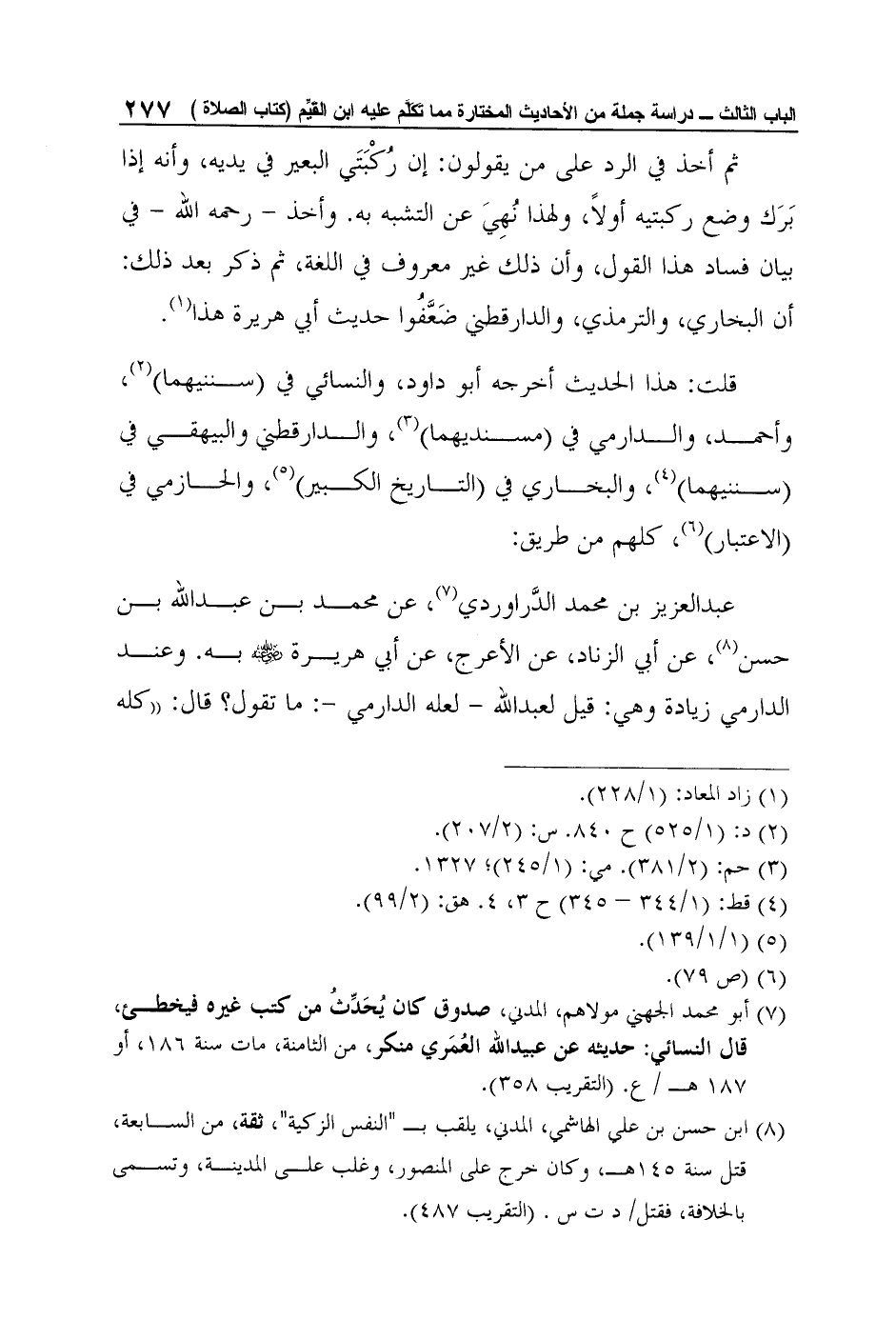 عبد العزيز بن محمد الدَّراوردي7، عن محمد بن عبد الله بن حسن8، عن أبي الزناد، عن الأعرج، عن أبي هريرة رضي الله عنه به. وعند الدارمي زيادة وهي: قيل لعبد الله - لعله الدارمي -: ما تقول؟ قال: "كله