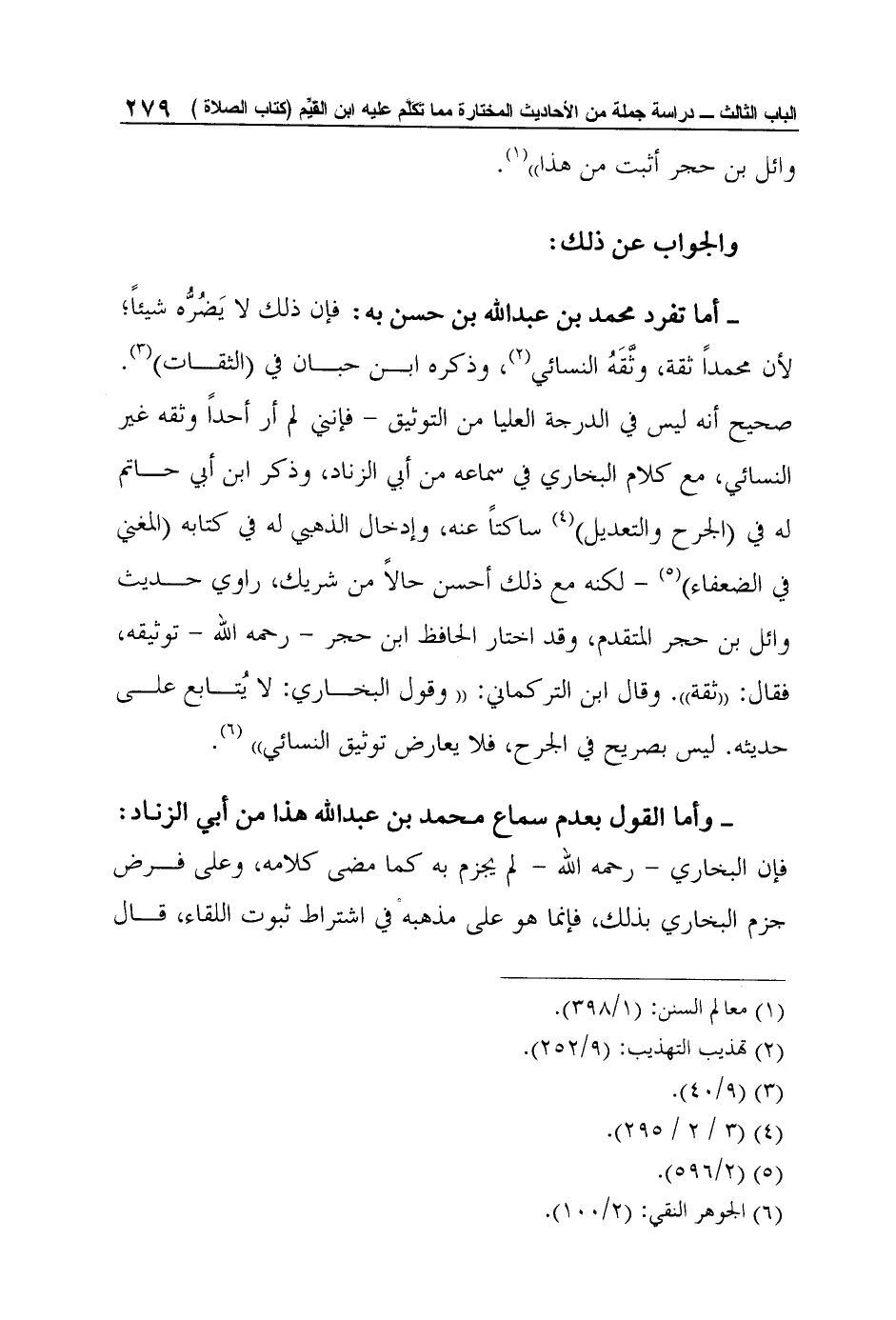 - أما تفرد محمد بن عبد الله بن حسن به: فإن ذلك لا يَضُرُّه شيئاً؛ لأن محمداً ثقة، وثَّقَهُ النسائي2، وذكره ابن حبان في (الثقات) 3. صحيح أنه ليس في الدرجة العليا من التوثيق - فإنني لم أر أحداً وثقه غير النسائي، مع كلام البخاري في سماعه من أبي الزناد، وذكر ابن أبي حاتم له في (الجرح والتعديل) 4 ساكتاً عنه، وإدخال الذهبي له في كتابه (المغني في الضعفاء) 5 - لكنه مع ذلك أحسن حالاً من شريك، راوي حديث وائل بن حجر المتقدم، وقد اختار الحافظ ابن حجر - رحمه الله - توثيقه، فقال: "ثقة". وقال ابن التركماني: "وقول البخاري: "لا يُتابع على حديثه". ليس بصريح في الجرح، فلا يعارض توثيق النسائي"6.