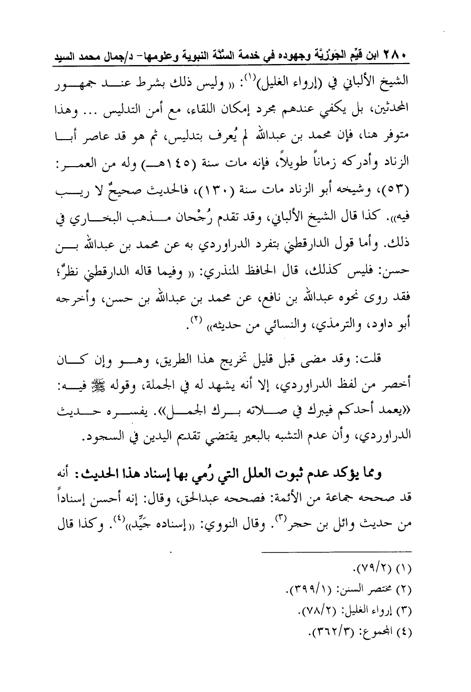 الشيخ الألباني في (إرواء الغليل) 1: "وليس ذلك بشرط عند جمهور المحدثين، بل يكفي عندهم مجرد إمكان اللقاء، مع أمن التدليس ... وهذا متوفر هنا، فإن محمد بن عبد الله لم يُعرف بتدليس، ثم هو قد عاصر أبا الزناد وأدركه زماناً طويلاً، فإنه مات سنة (145هـ) وله من العمر: (53) ، وشيخه أبو الزناد مات سنة (130) ، فالحديث صحيحٌ لا ريب فيه". كذا قال الشيخ الألباني، وقد تقدم رُجْحان مذهب البخاري في ذلك. وأما قول الدارقطني بتفرد الدراوردي به عن محمد بن عبد الله بن حسن: فليس كذلك، قال الحافظ المنذري: "وفيما قاله الدارقطني نظرٌ؛ فقد روى نحوه عبد الله بن نافع، عن محمد بن عبد الله بن حسن، وأخرجه أبو داود، والترمذي، والنسائي من حديثه"2.