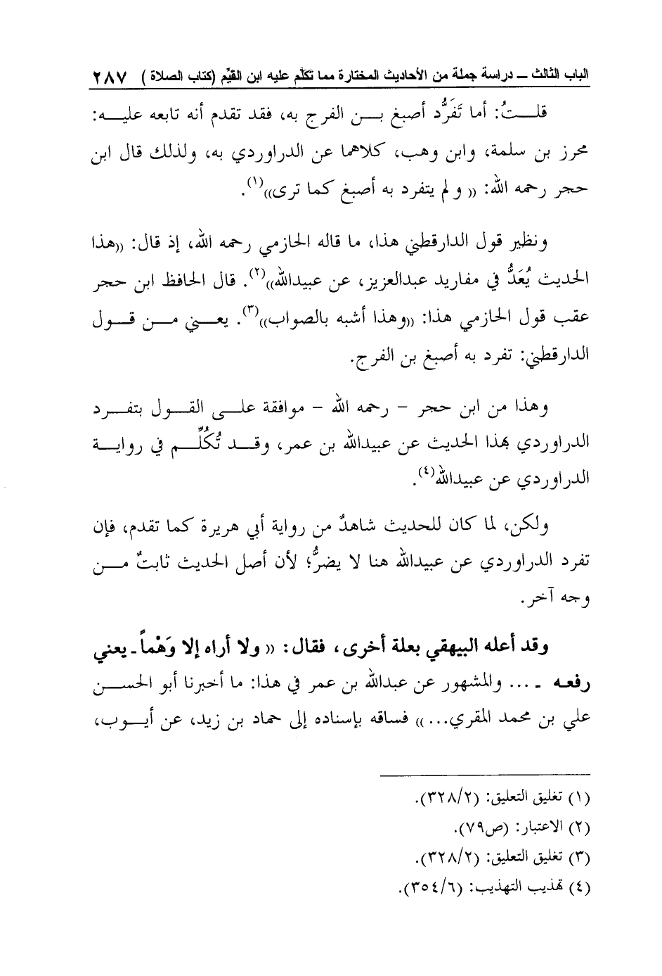 ونظير قول الدارقطني هذا، ما قاله الحازمي رحمه الله، إذ قال: "هذا الحديث يُعَدُّ في مفاريد عبد العزيز، عن عبيد الله"2. قال الحافظ ابن حجر عقب قول الحازمي هذا: "وهذا أشبه بالصواب"3. يعني من قول الدارقطني: "تفرد به أصبغ بن الفرج".