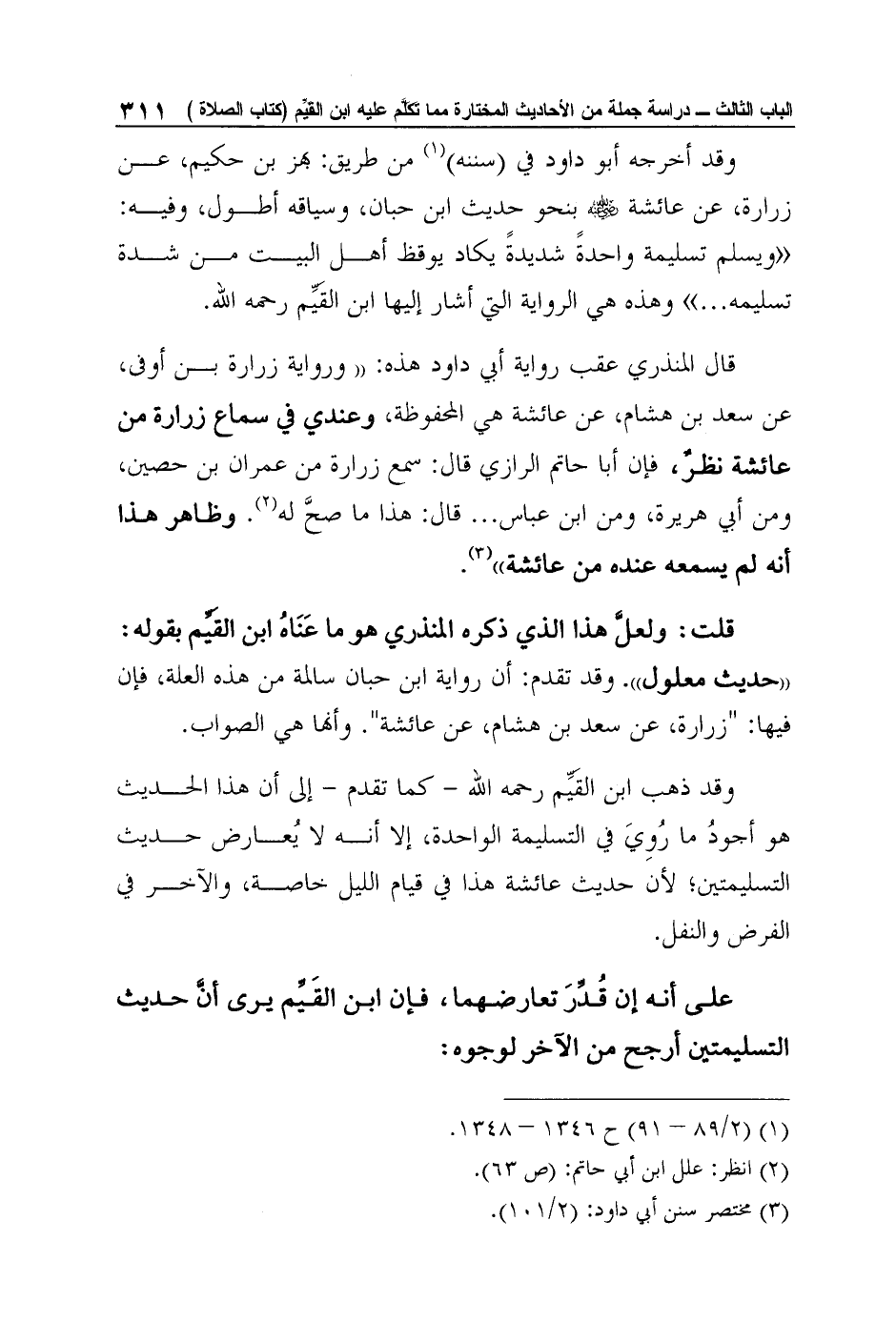 قلت: ولعلَّ هذا الذي ذكره المنذري هو ما عَنَاهُ ابن القَيِّم بقوله: "حديث معلول". وقد تقدم: أن رواية ابن حبان سالمة من هذه العلة، فإن فيها: "زرارة، عن سعد بن هشام، عن عائشة". وأنها هي الصواب.