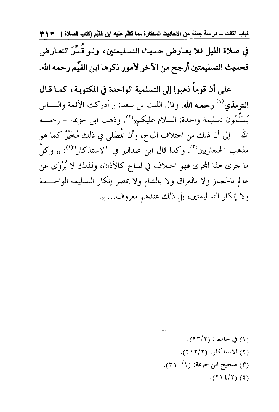 على أن قوماً ذهبوا إلى التسلمية الواحدة في المكتوبة، كما قال الترمذي1 رحمه الله. وقال الليث بن سعد: "أدركت الأئمة والناس يُسَلِّمُون تسليمة واحدة: السلام عليكم"2. وذهب ابن خزيمة - رحمه الله - إلى أن ذلك من اختلاف المباح، وأن المُصَلى في ذلك مُخَيَّرٌ كما هو مذهب الحجازيين3. وكذا قال ابن عبد البر في "الاستذكار"4: "وكلُّ ما جرى هذا المجرى فهو اختلاف في المباح كالأذان، ولذلك لا يُرْوَى عن عالم بالحجاز ولا بالعراق ولا بالشام ولا بمصر إنكار التسليمة الواحدة ولا إنكار التسليمتين، بل ذلك عندهم معروف ... ".