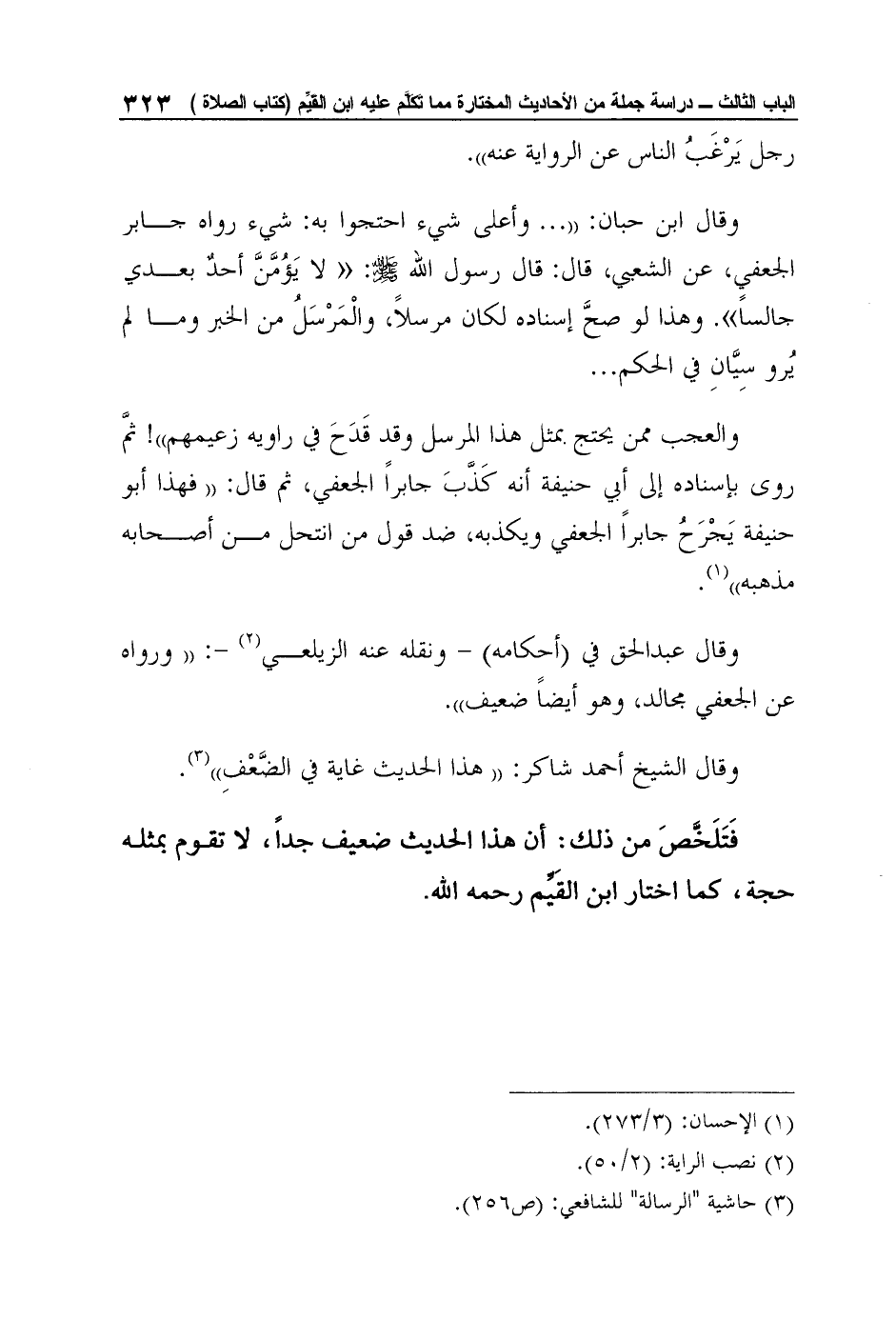 وقال ابن حبان: " ... وأعلى شيء احتجوا به: شيء رواه جابر الجعفي، عن الشعبي، قال: قال رسول الله صلى الله عليه وسلم: " لا يَؤُمَّنَّ أحدٌ بعدي جالساً". وهذا لو صحَّ إسناده لكان مرسلاً، والْمَرْسَلُ من الخبر وما لم يُرو سِيَّانِ في الحكم ...
