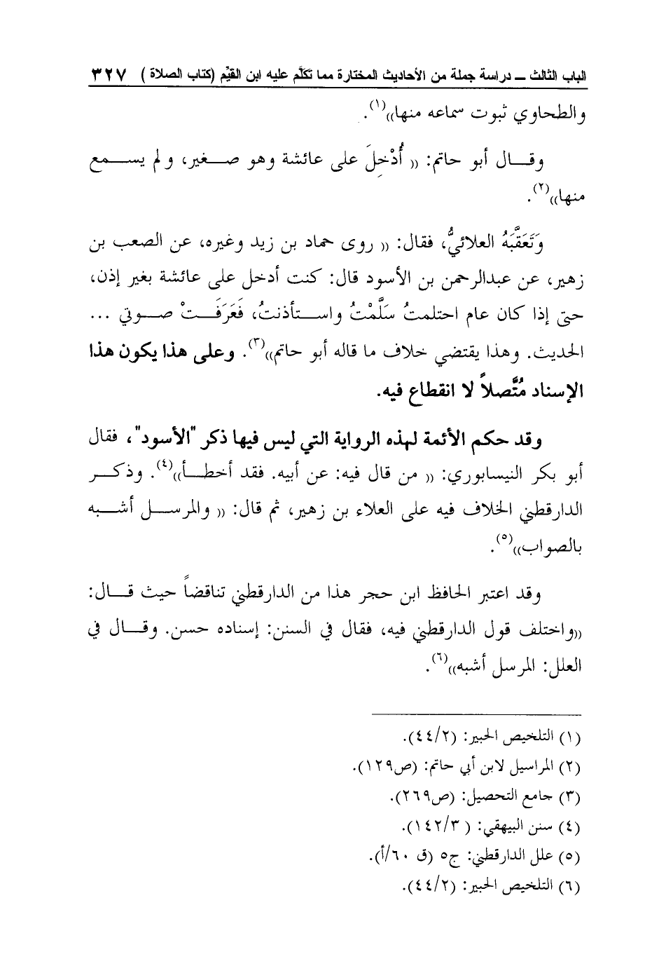 وَتَعَقَّبَهُ العلائيُّ، فقال: "روى حماد بن زيد وغيره، عن الصعب بن زهير، عن عبد الرحمن بن الأسود قال: كنت أدخل على عائشة بغير إذن، حتى إذا كان عام احتلمتُ سَلَّمْتُ واستأذنتُ، فَعَرَفَتْ صوتي ... الحديث. وهذا يقتضي خلاف ما قاله أبو حاتم"3. وعلى هذا يكون هذا الإسناد مُتَّصلاً لا انقطاع فيه.