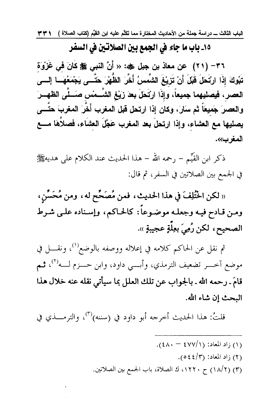36- (21) عن معاذ بن جبل رضي الله عنه: "أَنَّ النبي صلى الله عليه وسلم كَانَ فِي غَزْوَةِ تَبُوكَ إِذَا ارْتَحَلَ قَبْلَ أَنْ تَزِيْغَ الشَّمسُ أَخَّرَ الظُّهْرَ حَتَّى يَجْمَعُهَا إلى العصرِ، فيصليهما جميعاً، وإِذَا ارْتَحَلَ بعدَ زَيْغِ الشَّمْسِ صَلَّى الظهرَ والعصرَ جَمِيعَاً ثم سَارَ، وكان إذا ارتحل قبل المغرب أَخَّرَ المغربَ حتَّى يصليها مع العشاءِ، وإذا ارتحلَ بعد المغرب عَجَّلَ العِشَاء، فصلاَّهَا مع المغرب".
