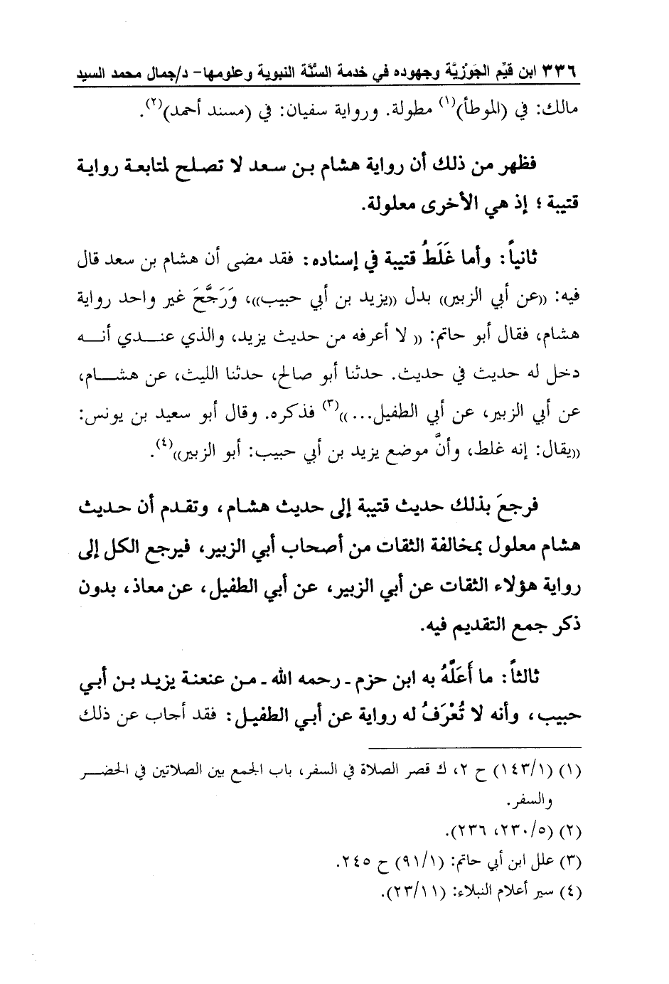 ثانياً: وأما غَلَطُ قتيبة في إسناده: فقد مضى أن هشام بن سعد قال فيه: "عن أبي الزبير" بدل "يزيد بن أبي حبيب"، وَرَجَّحَ غير واحد رواية هشام، فقال أبو حاتم: "لا أعرفه من حديث يزيد، والذي عندي أنه دخل له حديث في حديث. حدثنا أبو صالح، حدثنا الليث، عن هشام، عن أبي الزبير، عن أبي الطفيل ... "3 فذكره. وقال أبو سعيد بن يونس: "يقال: إنه غلط، وأنَّ موضع يزيد بن أبي حبيب: أبو الزبير"4.