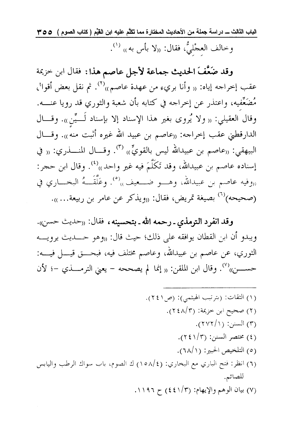 وقد ضَعَّفَ الحديث جماعة لأجل عاصم هذا: فقال ابن خزيمة عقب إخراجه إياه: "وأنا بريء من عهدة عاصم"2. ثم نقل بعض أقوال مُضَعِّفِيه، واعتذر عن إخراجه في كتابه بأن شعبة والثوري قد رويا عنه. وقال العقيلي: "ولا يُروى بغير هذا الإسناد إلا بإسناد لَيِّنٍ". وقال الدارقطني عقب إخراجه: "عاصم بن عبيد الله غيره أثبت منه". وقال البيهقي: "عاصم بن عبيد الله ليس بالقويِّ"3. وقال المنذري: "في إسناده عاصم بن عبيد الله، وقد تَكَلَّمَ فيه غير واحد"4. وقال ابن حجر: "وفيه عاصم بن عبيد الله، وهو ضعيف"5. وعَلَّقَهُ البخاري في (صحيحه) 6 بصيغة تمريض، فقال: "ويذكر عن عامر بن ربيعة ... ".
