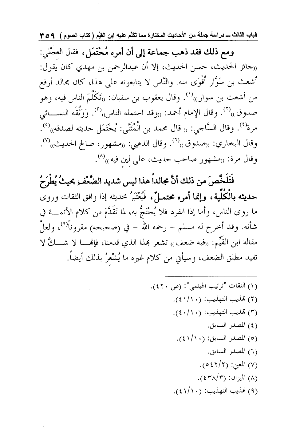 فَتَلَخَّصَ من ذلك أنَّ مجالداً هذا ليس شديد الضَّعْفِ بحيثُ يُطْرَحُ حديثه بالْكُلِّية، وإنما أمره محتملٌ، فَيُعْتَبَرُ بحديثه إذا وافق الثقات وروى ما روى الناس، وأما إذا انفرد فلا يُحْتَجُّ به، لما تَقَدَّمَ من كلام الأئمة في شأنه. وقد أخرج له مسلم - رحمه الله - في (صحيحه) مقروناً9، ولعلَّ مقالة ابن القَيِّم: "فيه ضعف" تشعر بهذا الذي قدمنا، فإنها لا شكَّ لا تفيد مطلق الضعف، وسيأتي من كلام غيره ما يُشْعِرُ بذلك أيضاً.
