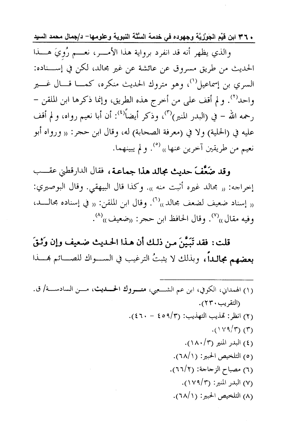 وقد ضَعَّفَ حديث مجالد هذا جماعة، فقال الدارقطني عقب إخراجه: "مجالد غيره أثبت منه ". وكذا قال البيهقي. وقال البوصيري: "إسناد ضعيف لضعف مجالد"6. وقال ابن الملقن: "في إسناده مجالد، وفيه مقال"7. وقال الحافظ ابن حجر: "ضعيف"8.
