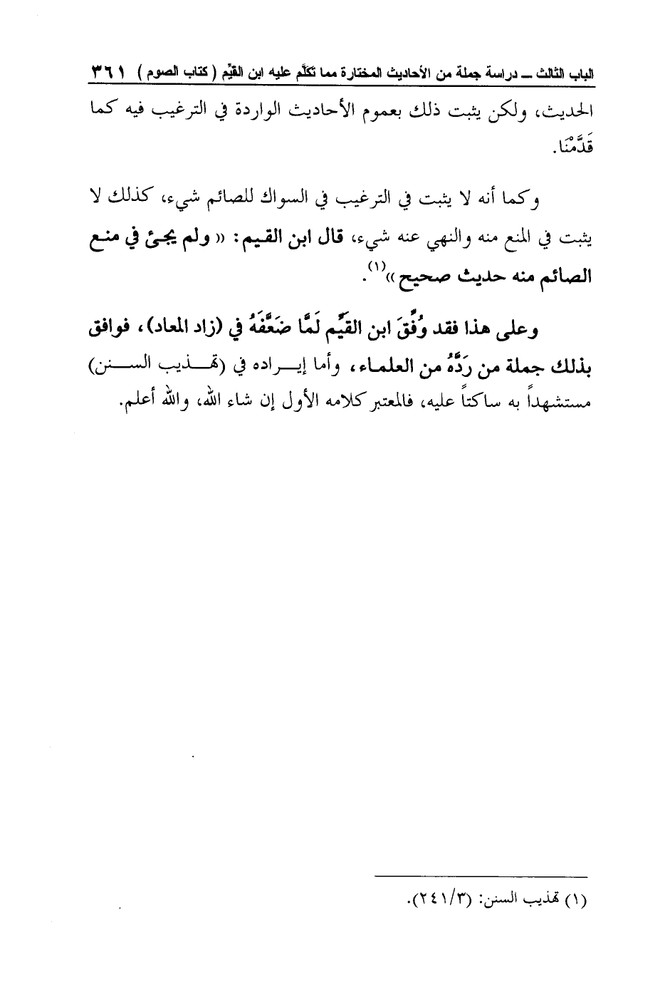وعلى هذا فقد وُفِّقَ ابن القَيِّم لَمَّا ضَعَّفَهُ في (زاد المعاد) ، فوافق بذلك جملة من رَدَّهُ من العلماء، وأما إيراده في (تهذيب السنن) مستشهداً به ساكتاً عليه، فالمعتبر كلامه الأول إن شاء الله، والله أعلم.