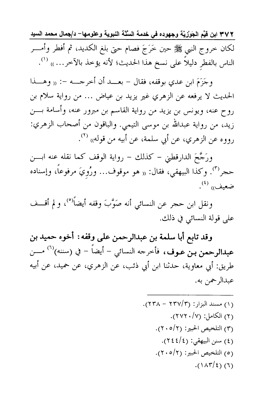 وقد تابع أبا سلمة بن عبد الرحمن على وقفه: أخوه حميد بن عبد الرحمن بن عوف، فأخرجه النسائي - أيضاً - في (سننه) 6 من طريق: أبي معاوية، حدثنا ابن أبي ذئب، عن الزهري، عن حميد، عن أبيه عبد الرحمن به.