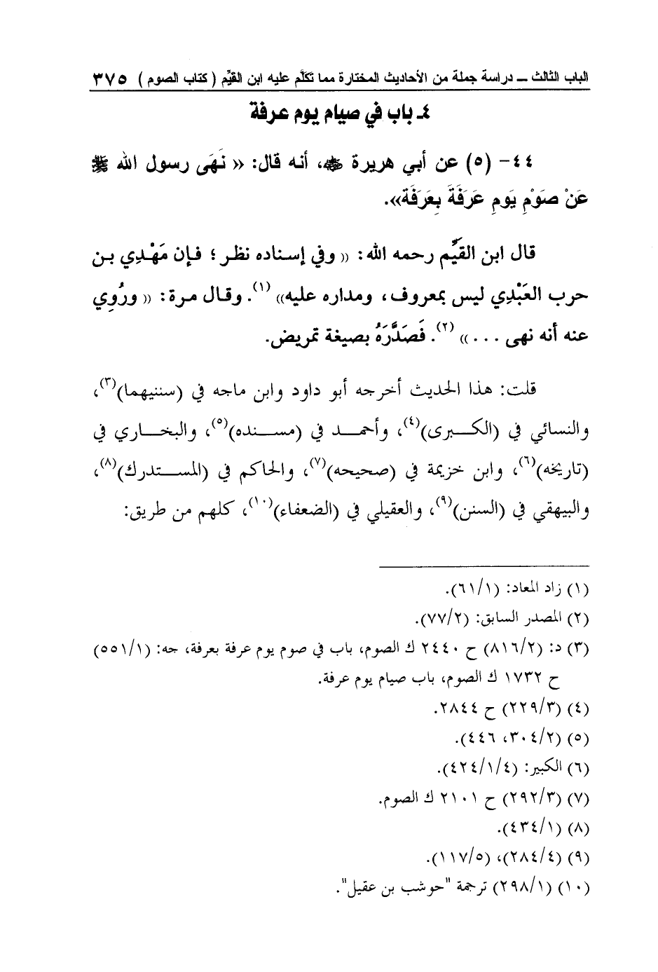 44- (5) عن أبي هريرة رضي الله عنه، أنه قال: "نَهَى رسول الله صلى الله عليه وسلم عَنْ صَوْمِ يَومِ عَرَفَةَ بِعَرَفَة".