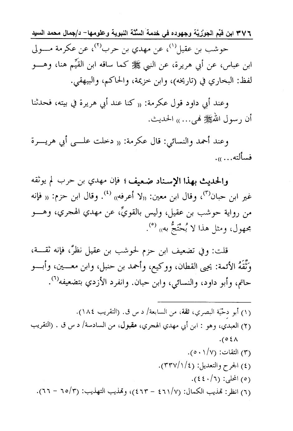 قلت: وفي تضعيف ابن حزم لحوشب بن عقيل نظرٌ، فإنه ثقة، وَثَّقَهُ الأئمة: يحيى القطان، ووكيع، وأحمد بن حنبل، وابن معين، وأبو حاتم، وأبو داود، والنسائي، وابن حبان. وانفرد الأزدي بتضعيفه6.