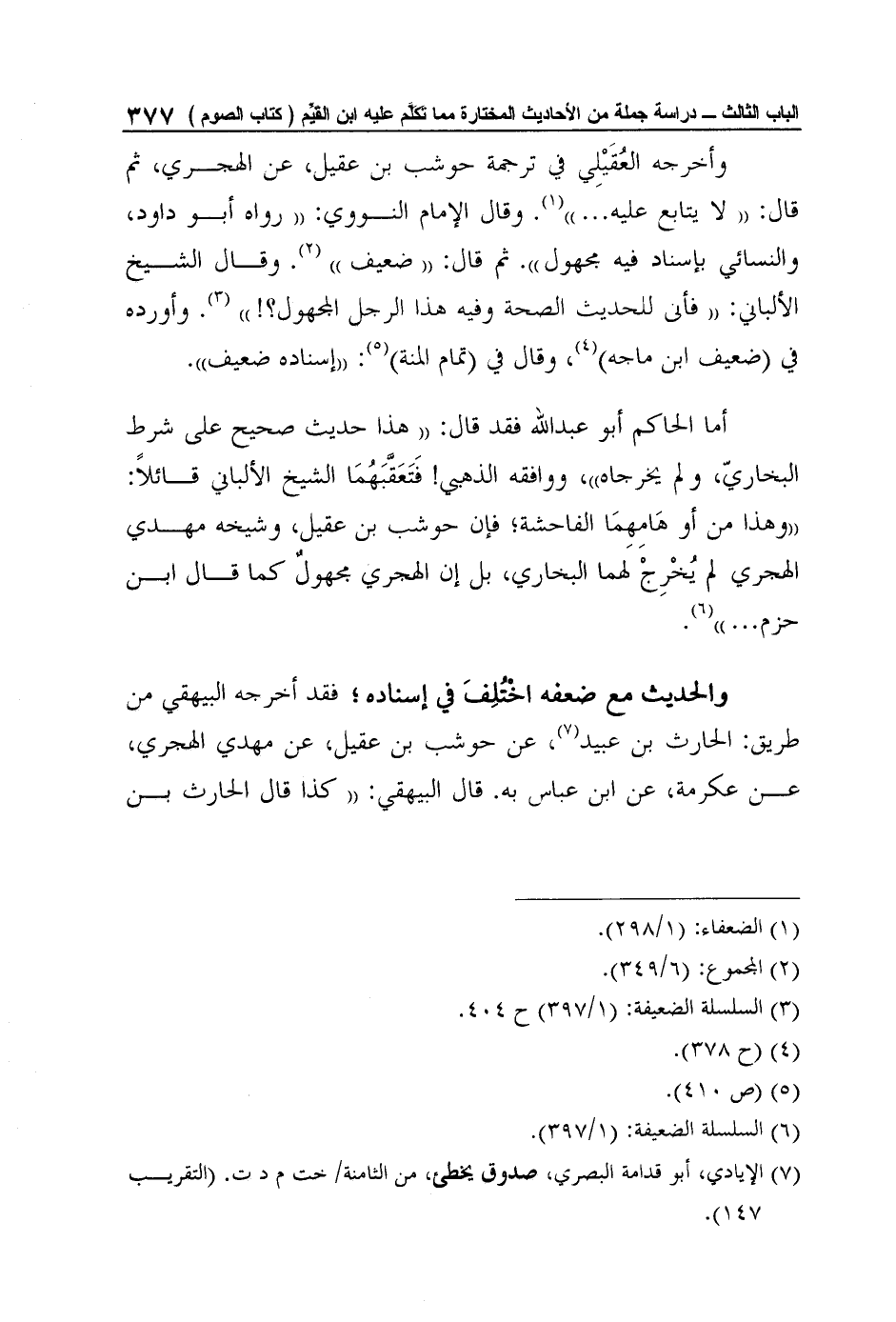 أما الحاكم أبو عبد الله فقد قال: "هذا حديث صحيح على شرط البخاريّ، ولم يخرجاه"، ووافقه الذهبي! فَتَعَقَّبَهُمَا الشيخ الألباني قائلاً: "وهذا من أو هَامِهِمَا الفاحشة؛ فإن حوشب بن عقيل، وشيخه مهدي الهجري لم يُخْرِجْ لهما البخاري، بل إن الهجري مجهولٌ كما قال ابن حزم ... "6.