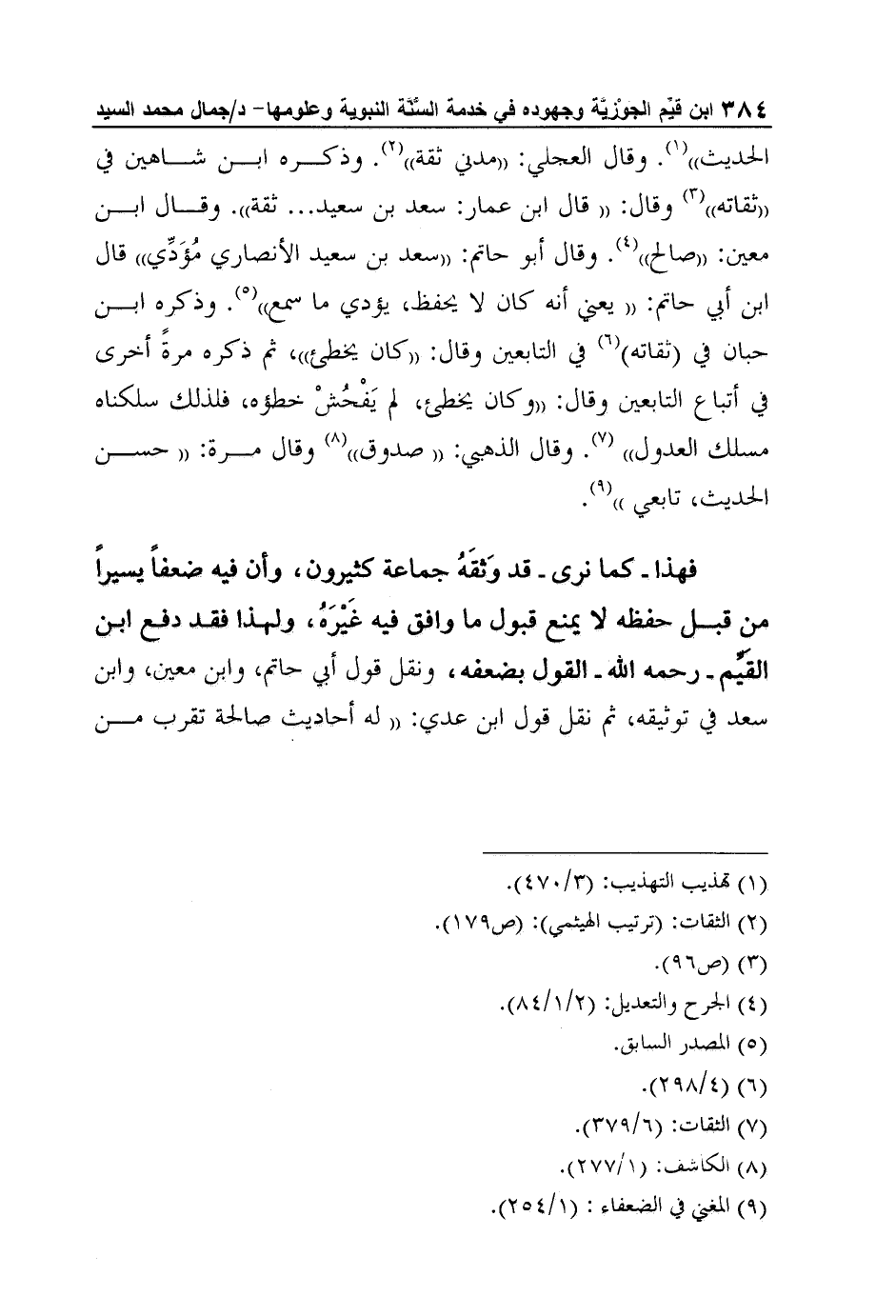 فهذا - كما نرى - قد وَثقَهُ جماعة كثيرون، وأن فيه ضعفاً يسيراً من قبل حفظه لا يمنع قبول ما وافق فيه غَيْرَهُ، ولهذا فقد دفع ابن القَيِّم - رحمه الله - القول بضعفه، ونقل قول أبي حاتم، وابن معين، وابن سعد في توثيقه، ثم نقل قول ابن عدي: "له أحاديث صالحة تقرب من