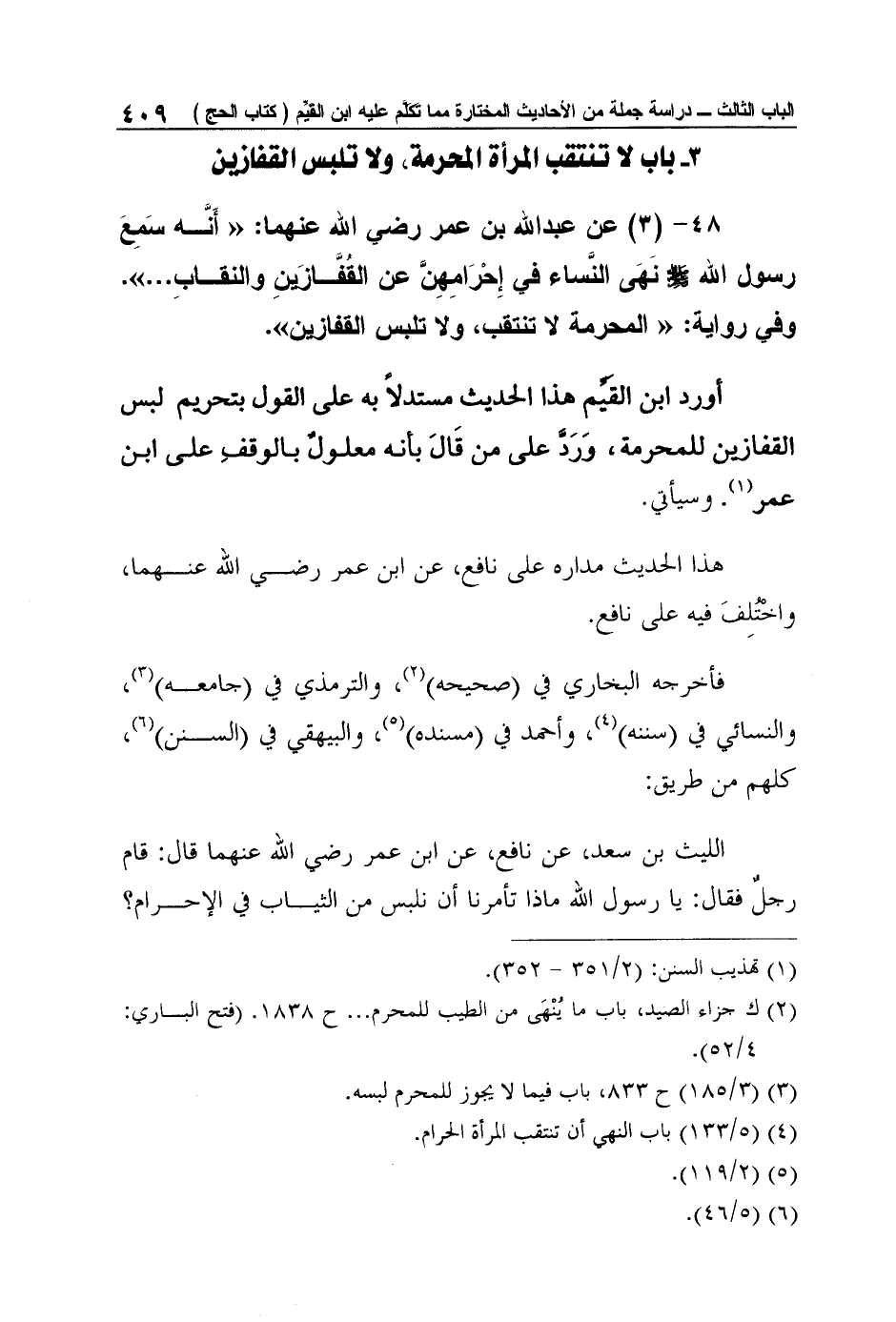 48- (3) عن عبد الله بن عمر رضي الله عنهما: "أَنَّه سَمِعَ رسول الله صلى الله عليه وسلم نَهَى النَّساء في إِحْرَامِهِنَّ عن القُفَّازَينِ والنقابِ ... ". وفي رواية: "المحرمة لا تنتقب، ولا تلبس القفازين".