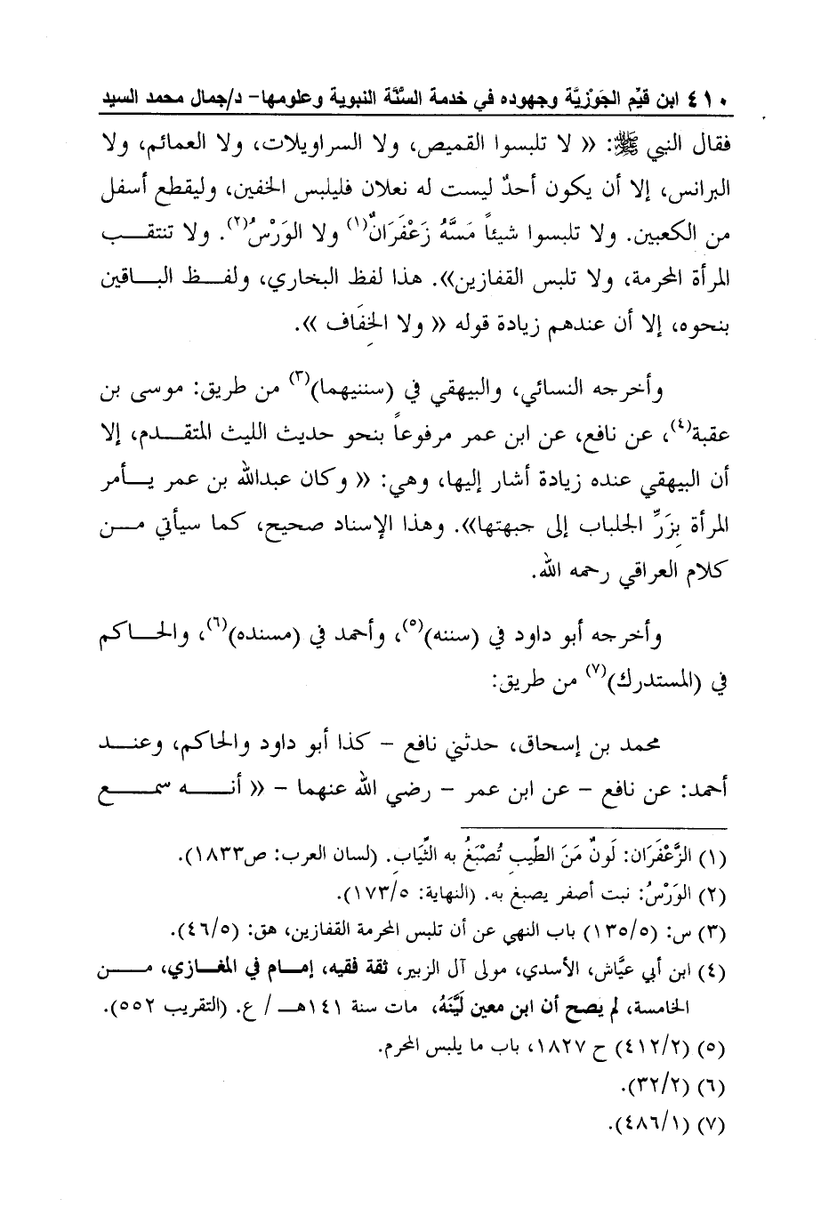 وأخرجه النسائي، والبيهقي في (سننيهما) 3 من طريق: موسى بن عقبة4، عن نافع، عن ابن عمر مرفوعاً بنحو حديث الليث المتقدم، إلا أن البيهقي عنده زيادة أشار إليها، وهي: "وكان عبد الله بن عمر يأمر المرأة بِزَرِّ الجلباب إلى جبهتها". وهذا الإسناد صحيح، كما سيأتي من كلام العراقي رحمه الله.
