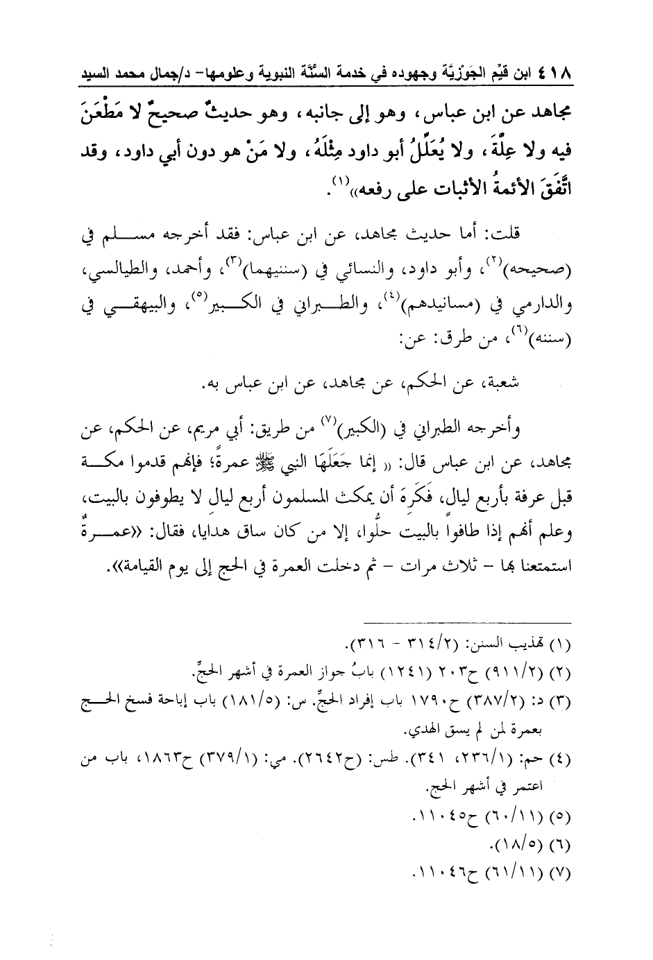 قلت: أما حديث مجاهد، عن ابن عباس: فقد أخرجه مسلم في (صحيحه) 2، وأبو داود، والنسائي في (سننيهما) 3، وأحمد، والطيالسي، والدارمي في (مسانيدهم) 4، والطبراني في الكبير5، والبيهقي في (سننه) 6، من طرق: عن: شعبة، عن الحكم، عن مجاهد، عن ابن عباس به.