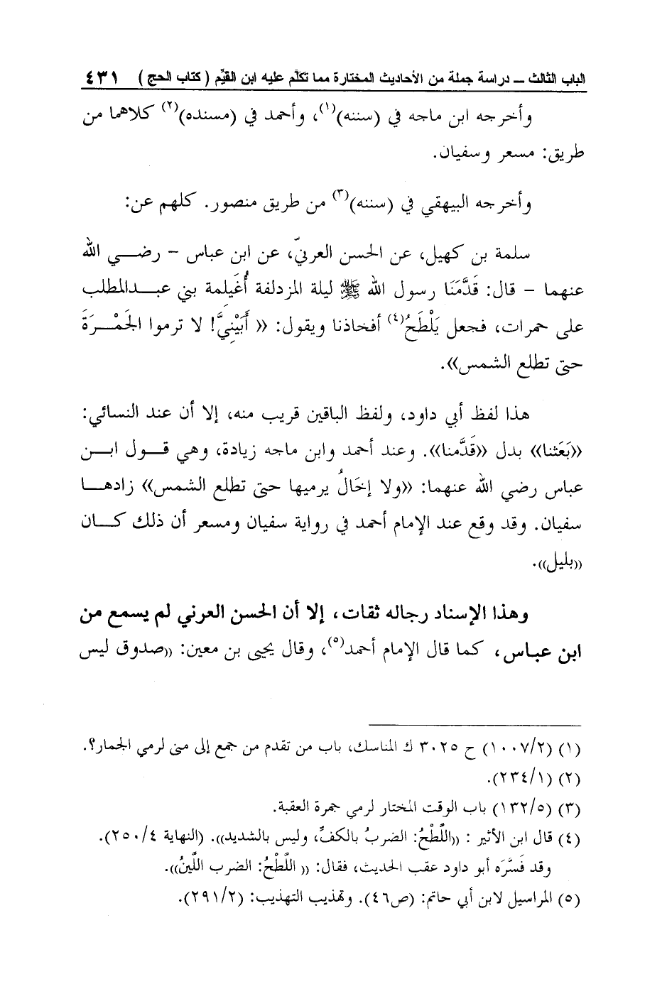 سلمة بن كهيل، عن الحسن العرنيّ، عن ابن عباس - رضي الله عنهما - قال: قَدَّمَنَا رسول الله صلى الله عليه وسلم ليلة المزدلفة أُغَيلِمة بني عبد المطلب على حمرات، فجعل يَلْطَحُ4 أفخاذنا ويقول: "أَبَيْنِيَّ! لا ترموا الجَمْرَةَ حتى تطلع الشمس".
