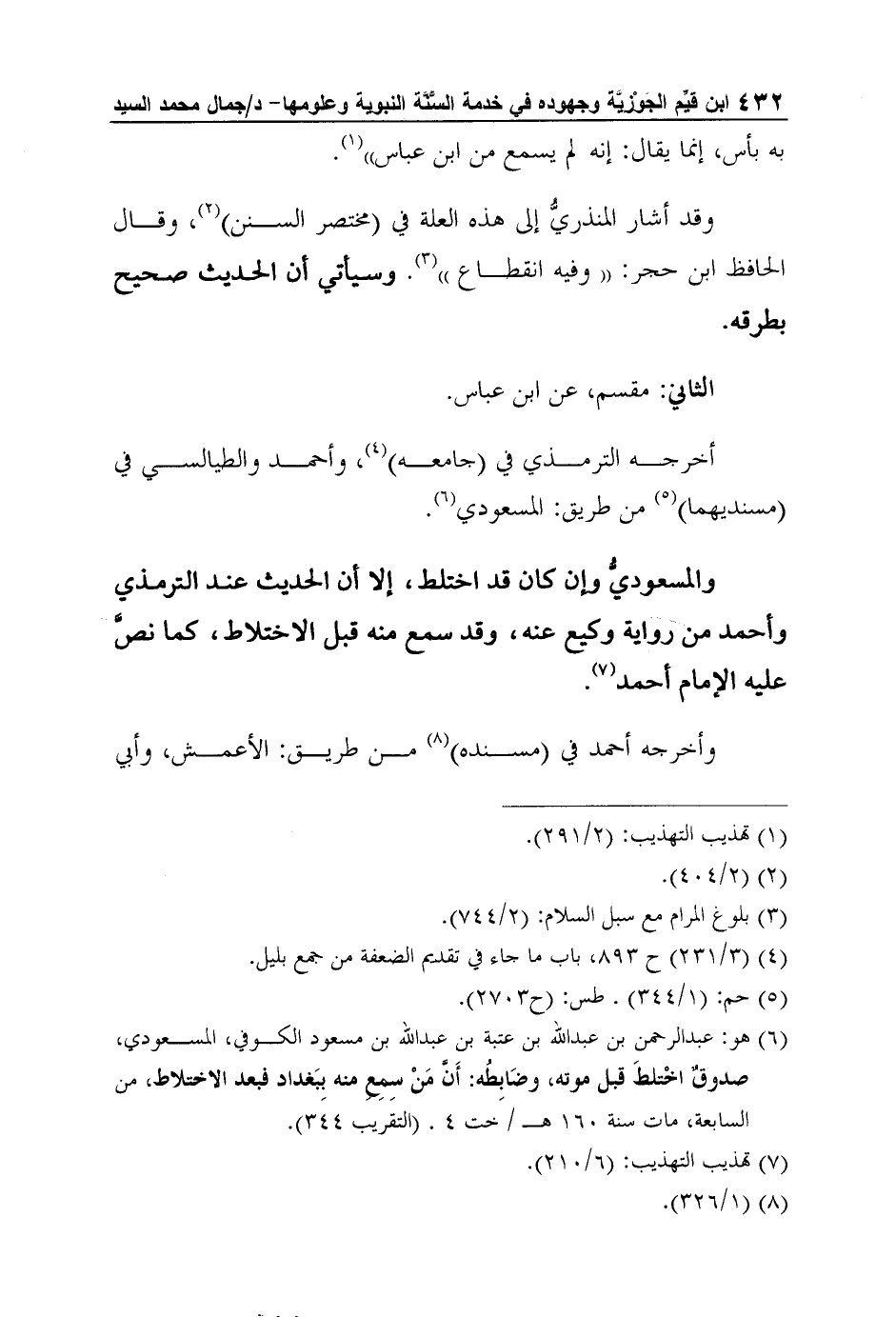 6 هو: عبد الرحمن بن عبد الله بن عتبة بن عبد الله بن مسعود الكوفي، المسعودي، صدوقٌ اخْتلطَ قبل موته، وضَابِطُه: أَنَّ مَنْ سِمِعِ منه بِبَغداد فبعد الاختلاط، من السابعة، مات سنة 160 هـ / خت 4. (التقريب 344) .