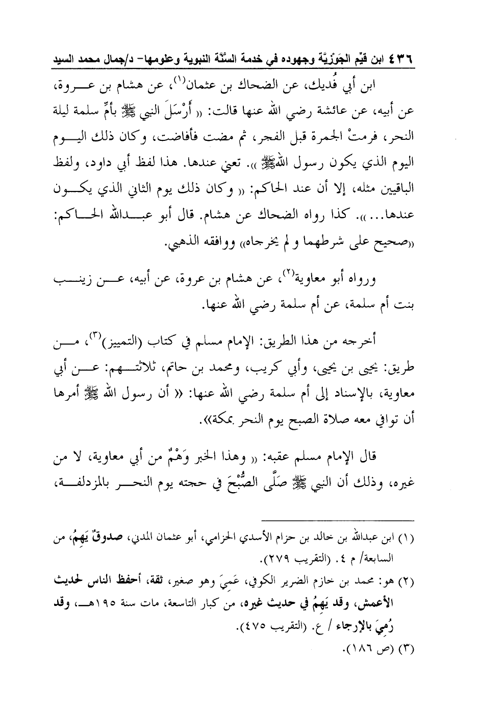 أخرجه من هذا الطريق: الإمام مسلم في كتاب (التمييز) 3، من طريق: يحيى بن يحيى، وأبي كريب، ومحمد بن حاتم، ثلاثتهم: عن أبي معاوية، بالإسناد إلى أم سلمة رضي الله عنها: "أن رسول الله صلى الله عليه وسلم أمرها أن توافي معه صلاة الصبح يوم النحر بمكة".