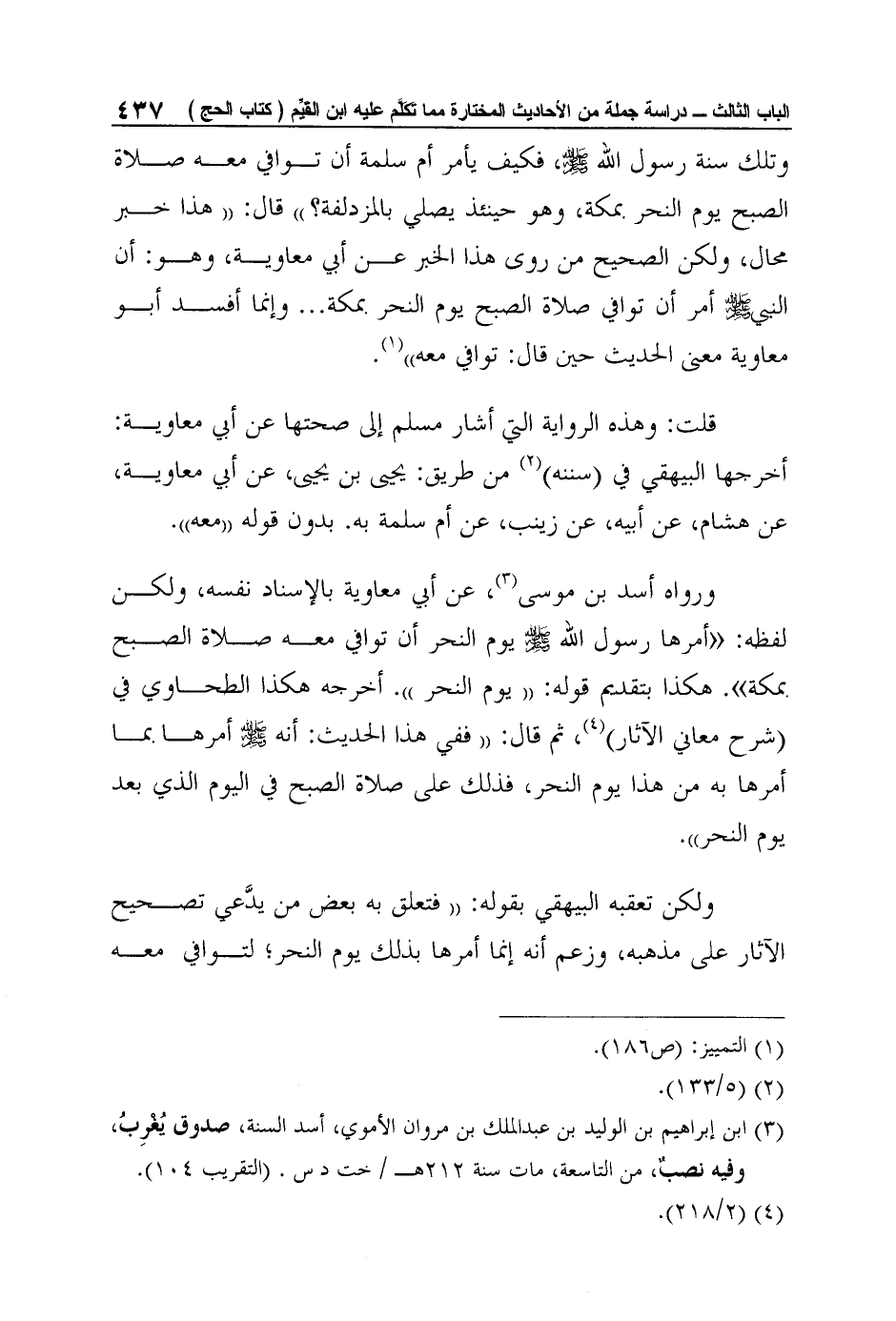 وتلك سنة رسول الله صلى الله عليه وسلم، فكيف يأمر أم سلمة أن توافي معه صلاة الصبح يوم النحر بمكة، وهو حينئذ يصلي بالمزدلفة؟ " قال: "هذا خبر محال، ولكن الصحيح من روى هذا الخبر عن أبي معاوية، وهو: أن النبي صلى الله عليه وسلم أمر أن توافي صلاة الصبح يوم النحر بمكة ... وإنما أفسد أبو معاوية معنى الحديث حين قال: توافي معه"1.