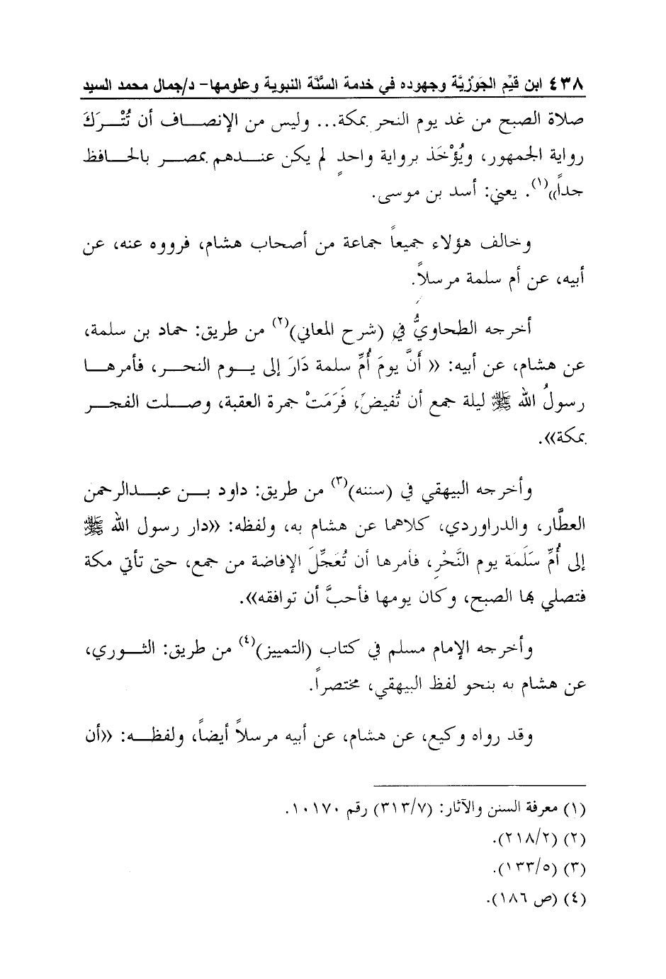 وأخرجه البيهقي في (سننه) 3 من طريق: داود بن عبد الرحمن العطَّار، والدراوردي، كلاهما عن هشام به، ولفظه: "دار رسول الله صلى الله عليه وسلم إلى أُمِّ سَلَمَة يوم النَّحْرِ، فأمرها أن تُعَجِّلَ الإفاضة من جمع، حتى تأتي مكة فتصلي بها الصبح، وكان يومها فأحبَّ أن توافقه".