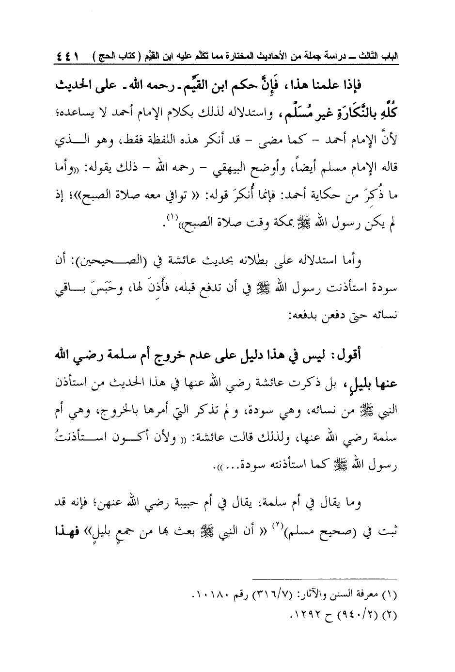 فإذا علمنا هذا، فَإِنَّ حكم ابن القَيِّم - رحمه الله - على الحديث كُلِّهِ بالنَّكَارَةِ غير مُسَلَّم، واستدلاله لذلك بكلام الإمام أحمد لا يساعده؛ لأنَّ الإمام أحمد - كما مضى - قد أنكر هذه اللفظة فقط، وهو الذي قاله الإمام مسلم أيضاً، وأوضح البيهقي - رحمه الله - ذلك يقوله: "وأما ما ذُكِرَ من حكاية أحمد: فإنما أُنكرَ قوله: "توافي معه صلاة الصبح"؛ إذ لم يكن رسول الله صلى الله عليه وسلم بمكة وقت صلاة الصبح"1.