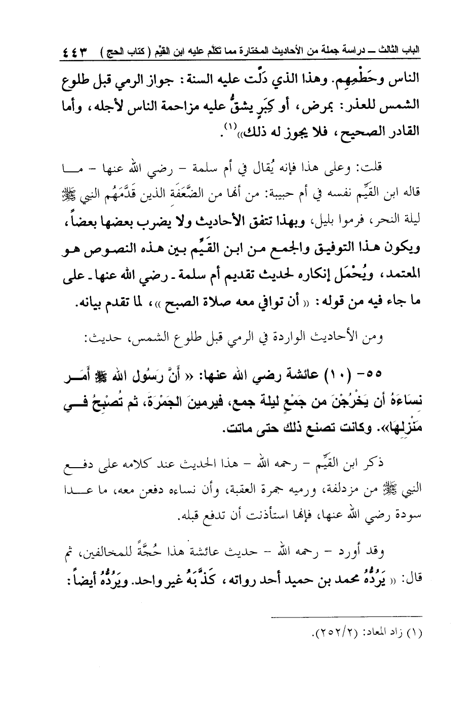 قلت: وعلى هذا فإنه يُقال في أم سلمة - رضي الله عنها - ما قاله ابن القَيِّم نفسه في أم حبيبة: من أنها من الضَّعَفَةِ الذين قَدَّمَهُم النبي صلى الله عليه وسلم ليلة النحر، فرموا بليل، وبهذا تتفق الأحاديث ولا يضرب بعضها بعضاً، ويكون هذا التوفيق والجمع من ابن القَيِّم بين هذه النصوص هو المعتمد، ويُحْمَل إنكاره لحديث تقديم أم سلمة - رضي الله عنها - على ما جاء فيه من قوله: "أن توافي معه صلاة الصبح"، لما تقدم بيانه.