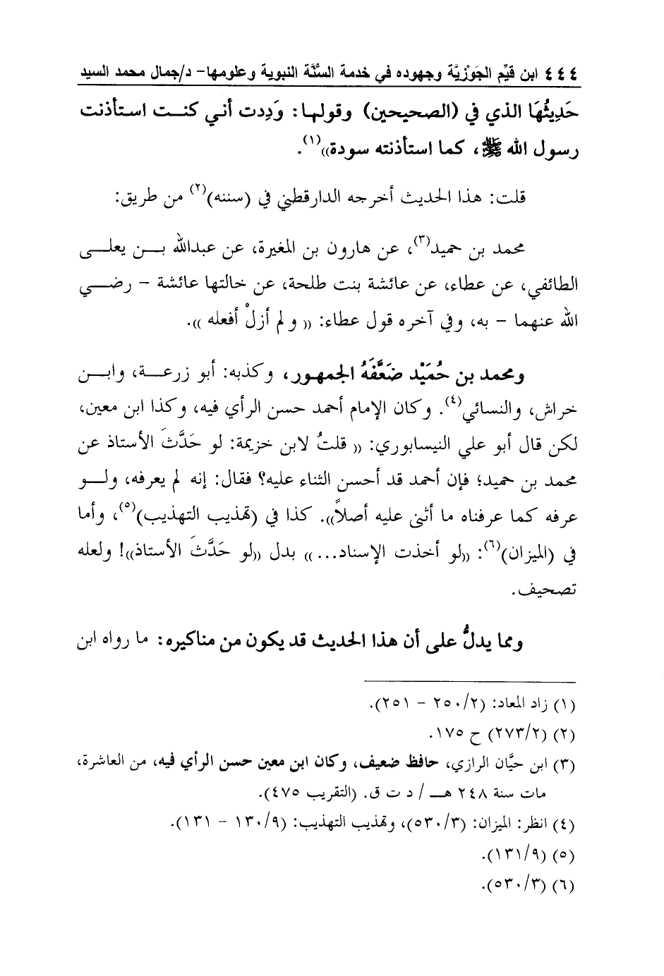ومحمد بن حُمَيْد ضَعَّفَهُ الجمهور، وكذبه: أبو زرعة، وابن خراش، والنسائي4. وكان الإمام أحمد حسن الرأي فيه، وكذا ابن معين، لكن قال أبو علي النيسابوري: "قلتُ لابن خزيمة: لو حَدَّثَ الأستاذ عن محمد بن حميد؛ فإن أحمد قد أحسن الثناء عليه؟ فقال: إنه لم يعرفه، ولو عرفه كما عرفناه ما أثنى عليه أصلاً". كذا في (تهذيب التهذيب) 5، وأما في (الميزان) 6: "لو أخذت الإسناد ... " بدل "لو حَدَّثَ الأستاذ"! ولعله تصحيف.