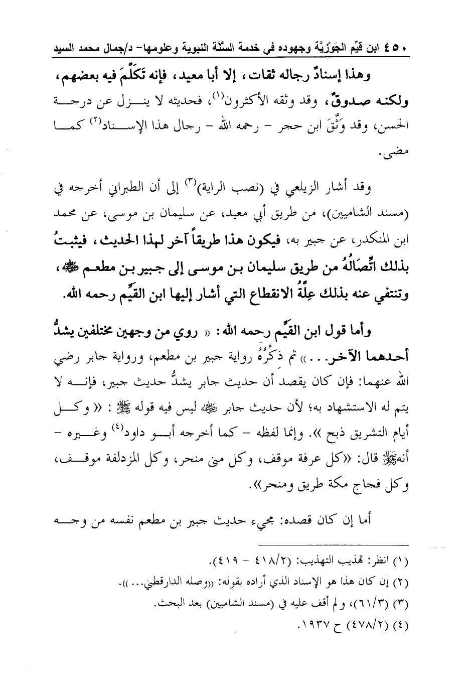 وأما قول ابن القَيِّم رحمه الله: " روي من وجهين مختلفين يشدُّ أحدهما الآخر ... " ثم ذِكْرُهُ رواية جبير بن مطعم، ورواية جابر رضي الله عنهما: فإن كان يقصد أن حديث جابر يشدُّ حديث جبير، فإنه لا يتم له الاستشهاد به؛ لأن حديث جابر رضي الله عنه ليس فيه قوله صلى الله عليه وسلم: "وكل أيام التشريق ذبح ". وإنما لفظه - كما أخرجه أبو داود4 وغيره - أنه صلى الله عليه وسلم قال: "كل عرفة موقف، وكل منى منحر، وكل المزدلفة موقف، وكل فجاج مكة طريق ومنحر".