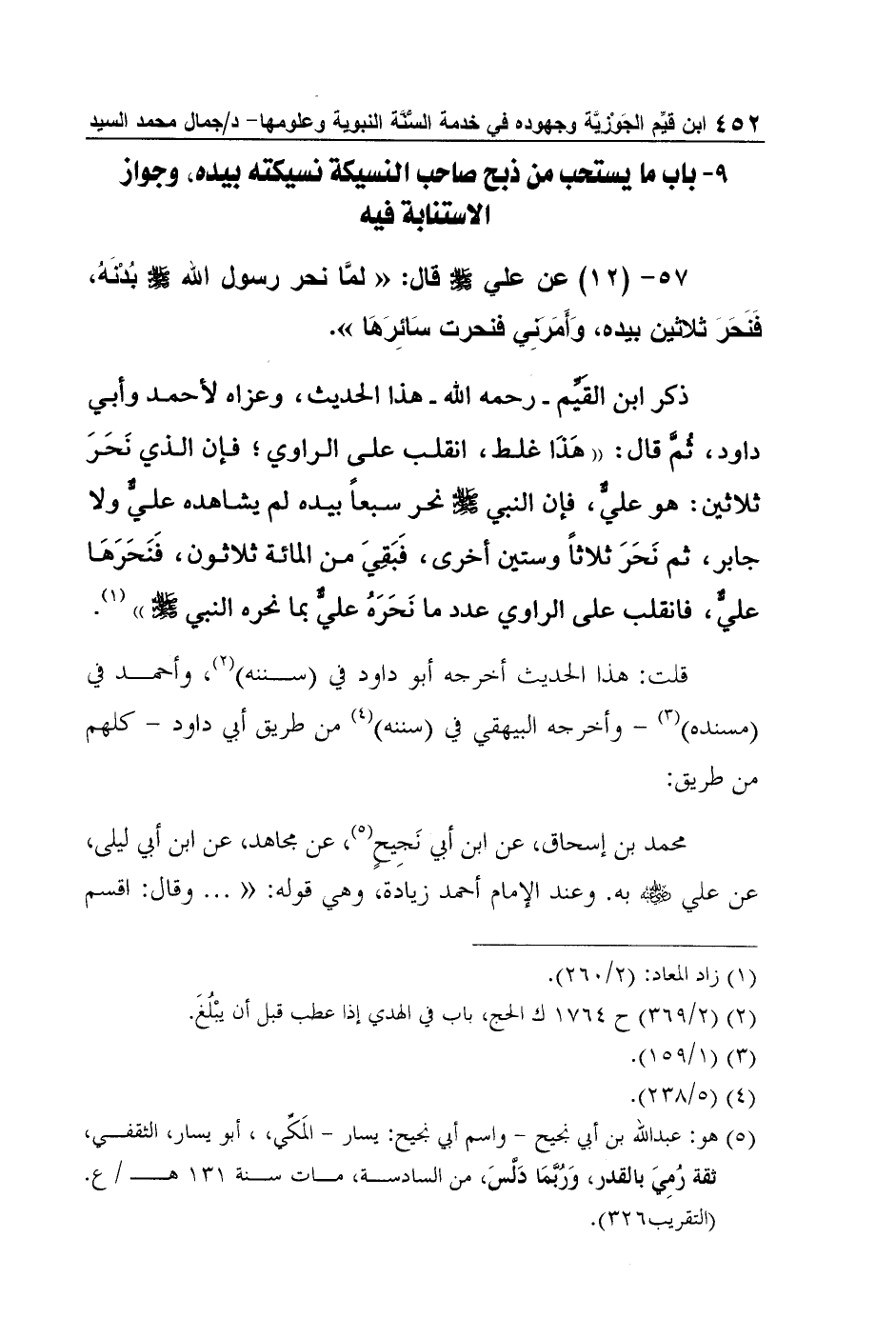 ذكر ابن القَيِّم - رحمه الله - هذا الحديث، وعزاه لأحمد وأبي داود، ثُمَّ قال: "هَذَا غلط، انقلب على الراوي؛ فإن الذي نَحَرَ ثلاثين: هو عليٌّ، فإن النبي صلى الله عليه وسلم نحر سبعاً بيده لم يشاهده عليٌّ ولا جابر، ثم نَحَرَ ثلاثاً وستين أخرى، فَبَقِيَ من المائة ثلاثون، فَنَحَرَهَا عليٌّ، فانقلب على الراوي عدد ما نَحَرَهُ عليٌّ بما نحره النبي صلى الله عليه وسلم "1.